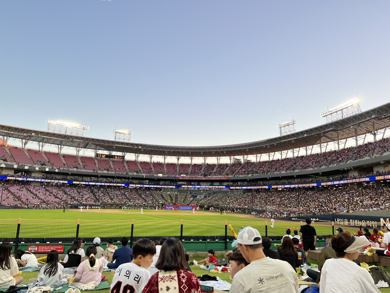 기아 구장에는 아이들 놀 수 있는 놀이터 시설과 모래놀이터가 잘 구비되어 있는 편이라 외야석에 아이들 데리고 가서 돗자리 깔아 놓고 보기 좋은 구조였다. 우연인지 주변에 오래전부터 야구광팬이었던 엄마들이 많아서 자연스럽게 나도 아이 데리고 껴서 갈 기회가 생겼다. 아이는 친구들과 놀 시간을 주고 나는 야구라는 것을 진지하게 관람하기 시작했다.