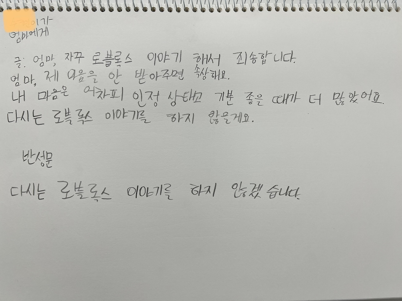 쓰라고 한 적도 없는데 자발적으로 써서 보여주는 이 반성문을 보니 나에게 휘몰아치던 부정적인 감정이 스르르 녹는 기분이 든다.