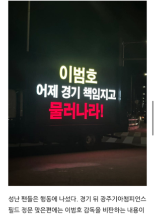 어떤 연예인들은 본인 기사에 달리는 악성 댓글 때문에 극심한 우울증에 시달리다가 생을 마감하는 극단적인 선택을 하기도 한다. 그런데 온라인상에서 굳이 클릭하고 들어가서 봐야 하는 댓글창이 아니라, 경기가 끝난 감독에게 대놓고 보라고 트럭에 반말로 그만두고 때려치우라는 메시지를 보내는 건 조금 과한 처사인 것으로 보인다.