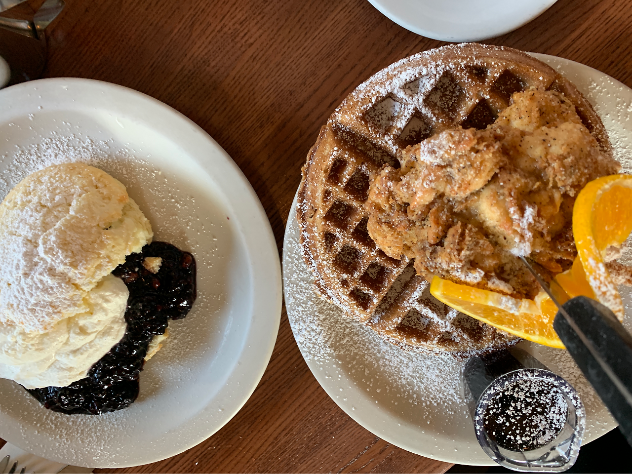 그리고 먼 길을 떠나기 전 포틀랜드의 힙함을 마지막까지 누리기 위해 브런치 카페에서 아침밥을 먹었다. 이름이 Screen door였는데, 구글에 잘못 검색하면 정말 지하철 스크린도어를 설치하는 회사가 나와서 정확히 검색해야 한다. 치킨 와플과 블루베리가 들어간 디저트류를 먹었다. 치킨 와플은 향이 강했고, 먹을만했다.