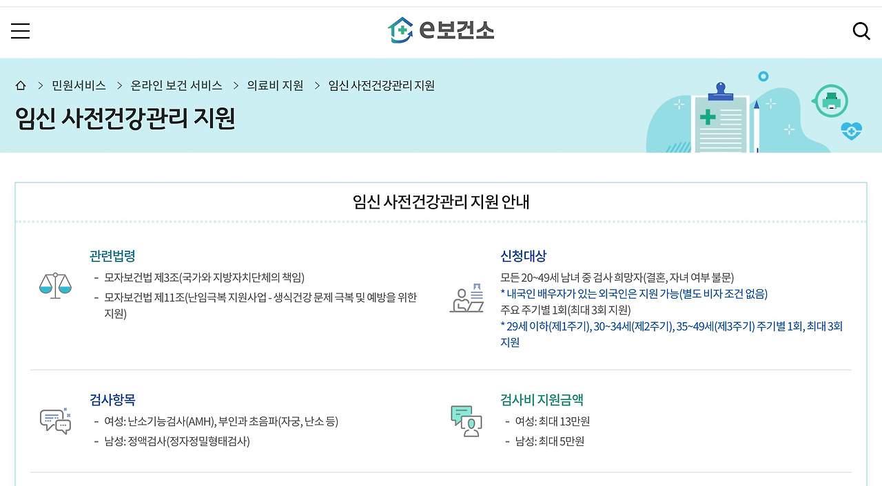 임신 전 관리의 중요성이 대두됨에 따라, 20-49세 남녀 중 검사를 희망하는 사람을 대상으로 여성의 경우 AMH와 부인과 초음파 검사비 최대 13만 원을 지원하고 있는 사업이 있다. 결혼 또는 임신을 준비하고 있거나, 당장 임신 계획이 없어서 미래의 임신을 걱정하고 있다면 신청하여 검사를 받아보면 좋겠다. 더불어 검사만 하지 말고, 반드시 전문의와 상담도 받아보길 바란다.