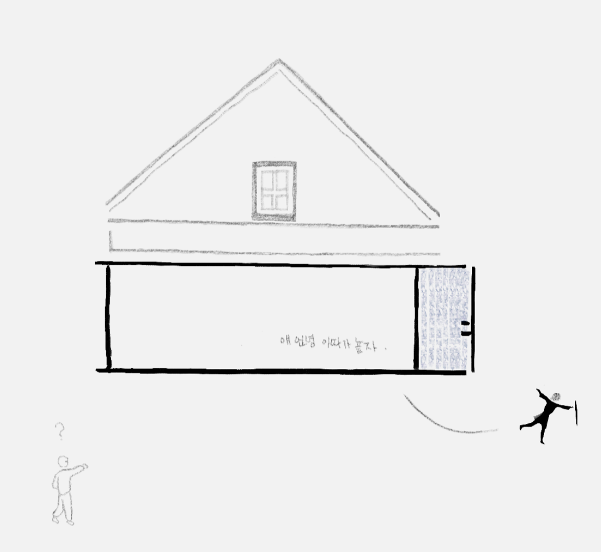 그 후로 몇 년이 더 흘러 고학년이 된 어느 날, 여느 때와 같이 집에 도착해 벨을 누르고 문이 열리기를 기다리며 서있었는데 갑자기 뭔가를 깨달았다. 멍하니 빨간 벽돌 벽을 바라보다가 문득 혜선이는 그때 인사도 없이 떠난 것이 아니라는 사실을 발견했다. 대문 옆 초인종 버튼이 붙어 있던 벽면엔 당시 혜선이가 남긴 오래된 낙서가 있었는데 집에 드나들 때마다 본 것이라 지금까지 각인되어 있다. '얘 연 녕 이 따 가 뇰 자'. 이게 뭔 소리야? 하고 이해 못 했던 7살의 독해력이나, 몰래 낙서를 하다가 들켜평소답지 않은 무안함으로 뒤도 안 돌아보고 달아나던 동갑내기 여자애의 문장력이나,모두 이별의 아쉬움을 나누기엔 턱없이 부족한 탓에 그 담벼락에 남긴 의미는 몇 년이 지나고 나서야 비로소 내게 전달되었다.