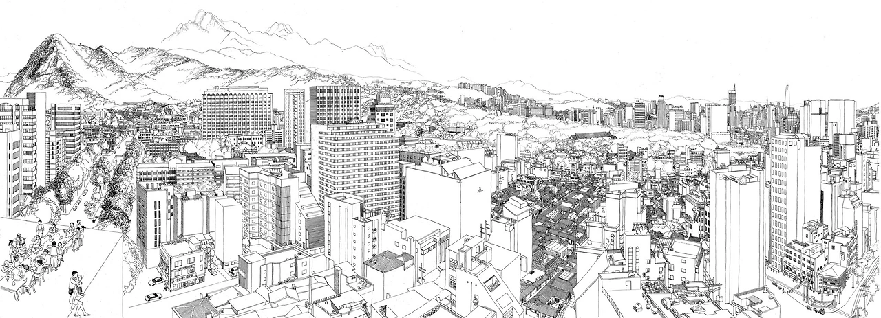 왼쪽 백악산과 우측 멀리 롯데타워 사이로 종로구 익선동이 보이는 펜화 <안충기의 펜화서울도감>