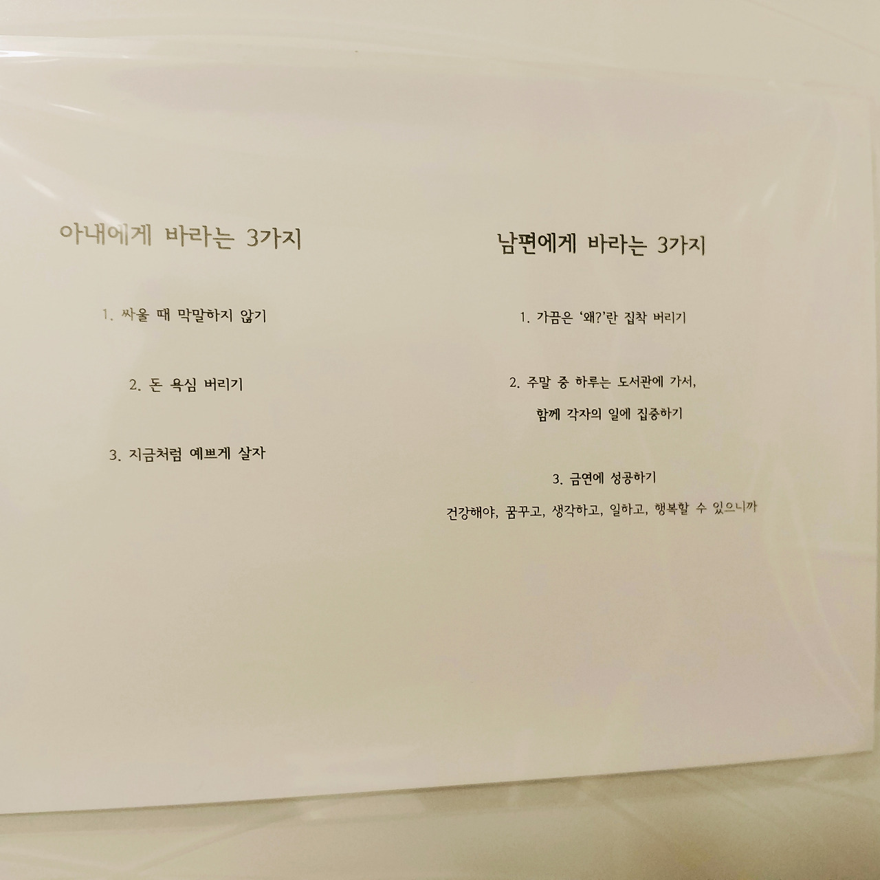 첫 번째 계획은 서로가 지켜줬으면 하는 것들에 대해 정하는 것이다. 아내가 남편에게 바라는 세 가지. 남편이 아내에게 바라는 세 가지가 바로 그것이다. 싸울 때면 서로에게 서운했던 것들이 터진다. 싸움의 원인과 상관없이 말이다. 그것들은 마음속에 조용히 쌓인 서로에 대한 오해와 불만이다. 이상하게도 평소에는 쉽게 털어놓지 못하는, 그런 오해와 불만….