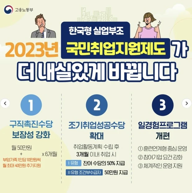 취준생을 지원하는 한국형 실업부조 제도이다. 내가 참여했던 건 2021년도인데, 올해에는 혜택이 훨씬 더 강화되어 시행 중이다. 1유형은 적극적으로 구직활동을 펼치면 6개월간 300만원의 촉진수당과 부양가족 1인당 10만원의 지원금을 받을 수 있다. 1, 2유형 모두 취업 후 6개월 고용유지 하면 50만원, 1년을 유지하면 100만원을 받을 수 있다. 혜택이 매우 좋기에, 취준생이라면 구체적인 조건을 따져서 꼭 챙겨야 하는 제도라고 생각한다.