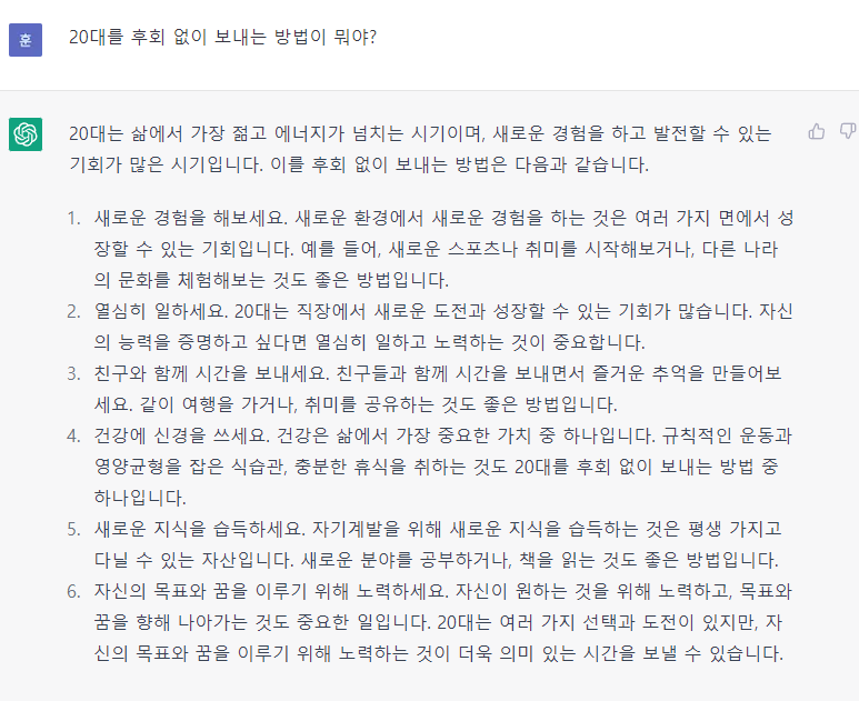 20대를 후회 없이 보내기 위해선 어떤 목표(대학 진학, 대기업 입사, 자격증 취득 등등)를 설정하는 것보단 삶의 태도를 고민하는 게 중요하다고 생각한다. 내가 20대를 보내며 갈고닦고 싶은 태도는 '길을 개척하려는 의지'이다. 오늘은 셀프 인터뷰 형식으로 이 태도를 자세히 정리해보려고 한다. 그 전에 먼저, 20대를 후회 없이 보내는 방법을 물으면 흔하게 나오는 대답부터 살펴보자. 요즘 너무나도 핫한 챗GPT에게 물어봤다.