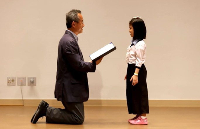 <우리들꽃 포토 에세이> 시상식에서 최재천 교수님이 아이와 눈을 맞추며 상장을 수여하고 있다.