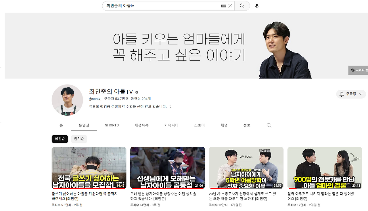 나는 유튜브 <최민준의 아들TV> 애청자이다. 주변 사람들은 "너가 그걸 왜 봐?"라는 반응을 종종 보인다. 사회생활 2년차, 만 27세 청년이 자녀교육 유튜브를 본다고 하니 의아하기 때문이다. 서울 기준, 남성의 평균 초혼 연령이 만 33세라고 한다. 굳이 평균치와 비교해본다면 6년이나 차이난다. 결혼이나 출산을 생각하기에도 이른데, 자녀교육에 관심을 가지기에는 더더욱 어린 나이임은 분명해 보인다. 하지만 내가 이 유튜브 채널에 빠진 이유는 결혼, 출산에 대한 관심 때문이 아니다!