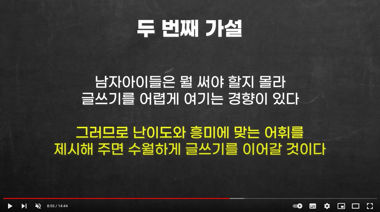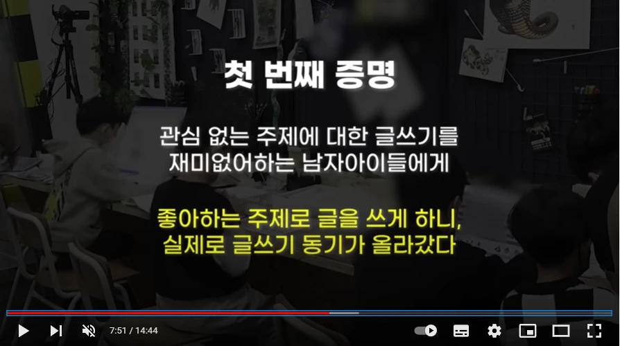 ->글쓰기를 싫어하는 아이들이 어떻게 하면 즐겁게 글쓰기에 참여할 수 있을지 연구하고, 적용해보는 영상이다. 최민준 소장님의 기본적인 자세는 항상 똑같다. 아이들의 눈높이에서, 아이들의 흥미를 불러일으킬 수 있도록, 속도를 맞춰서 접근하는 것.