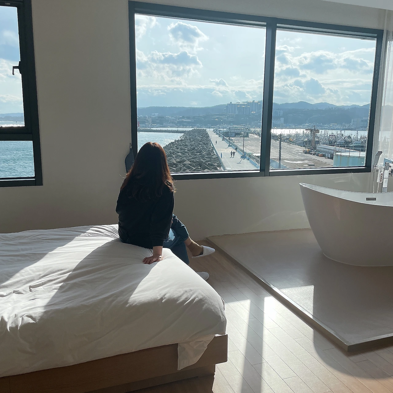 다행히 그 방이 남아 있었다. 방파제 바로 앞이라 객실에서 파도가 보이는 모습이 좋았다. 우리가 묵은 곳은 드라마 “동백꽃 필 무렵”의 배우들이 촬영 중 숙소로 사용한 곳이다. 드라마를 재미있게 보기도 해서 그 촬영지를 가보고 싶었는데 숙소에서 걸어서 5분 정도면 주인공 동백이의 카페 ’ 카멜리아‘가 있다.