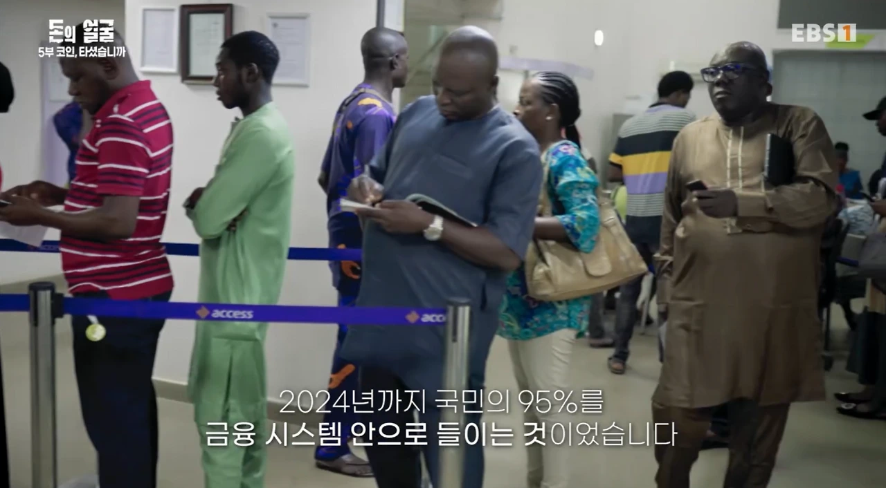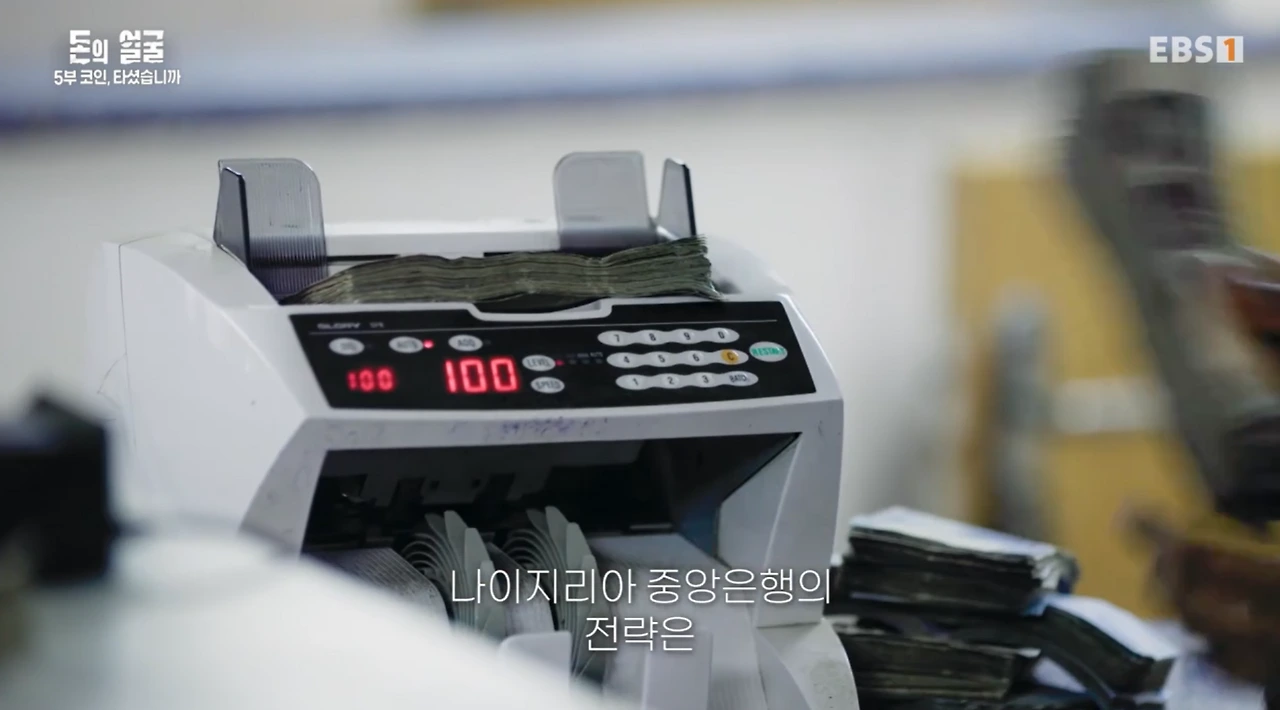 이런 시스템에 대한 반발 속 "완벽히 탈중앙화된" 비트코인이 만들어졌다. "탈중앙화"란 게 어떤 것인지 와닿지 않을 수 있다. 다큐에서 예시를 든 건 나이지리아다. 나이지리아 국민 대다수가 은행에 계좌를 가지고 있지 않다. 때문에 국가가 통화정책을 펼 수가 없다. 국가의 힘이 무력화되는 것이다. 다큐에선 은행이 통제권을 갖기 위해 신권을 발행했다가 대차게 말아먹은 사례를 보여준다. 대차게 말아먹었지만 결국 나이지리아 중앙은행이 하고자 한 건 "국민을 금융시스템 체제하에 두는 것"이었다. 통제력을 갖고자 한 것이다.