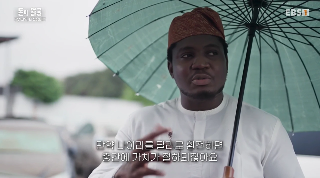 다큐에선 나이지리아의 한 자동차 중개인이 나온다. 이 자동차 중개인은 달러와 비트코인으로 주로 거래한다고 한다. 나이지리아 화폐는 사용하지 않는다고 단호히 말한다. 중간에 환전을 하게 되면 가치가 떨어질 수 있기 때문이다. 비트코인은 여러 나라와 거래 시 환율/수수료 영향을 받지 않기 때문에 손해 볼 일이 없기 때문이다. 나이지리아에서 만든 전자화폐 e나이라는 쓰지 않는다고 했다. 확장성이 없기 때문이다.
