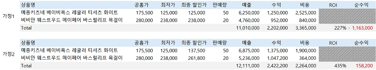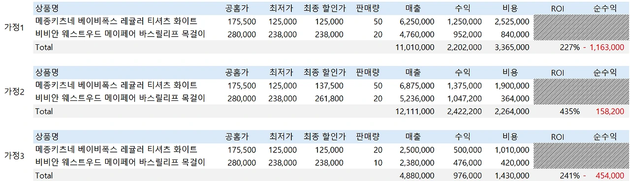 가정2와 가정3을 비교했을 때 가정2 매출이 압도적으로 높고 ROI, 순수익에서도 모두 좋은 결과를 보이는 것을 알 수 있다.