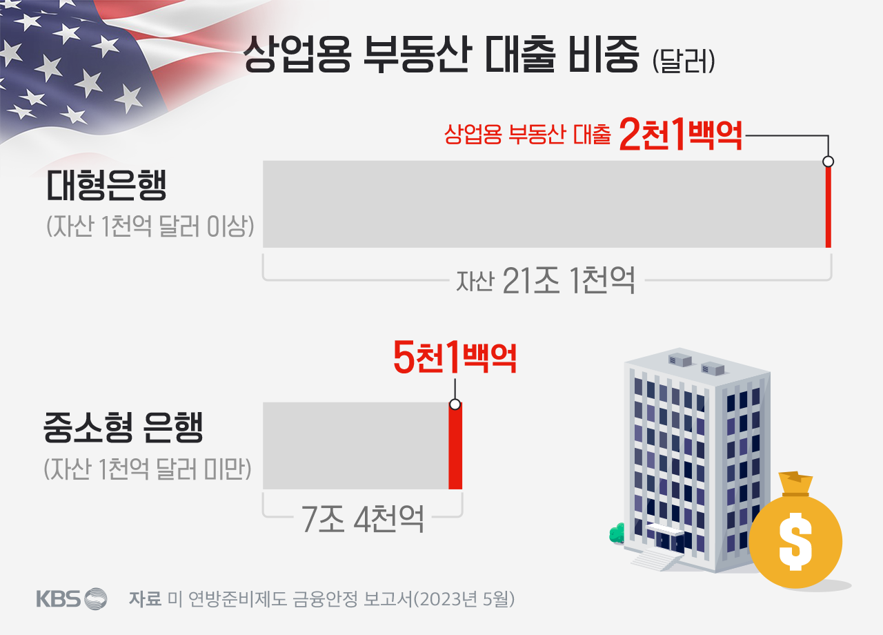 향후 3년간 만기가 도래하는 미국 상업용 부동산 대출이 2조 달러(약 2천700조 원)에 달하는 것으로 추산된다. 코로나19 이후 재택근무가 늘어나며 상업용 부동산 가치는 큰 폭으로 하락했다. 특히 상업용 부동산 가운데 당시 낮은 금리의 대출을 활용, 과도한 투자가 이뤄졌던 사무실과 다가구 주거용 아파트 등의 부실로 인한 버블이 형성되어 있다는 것이 문제다.