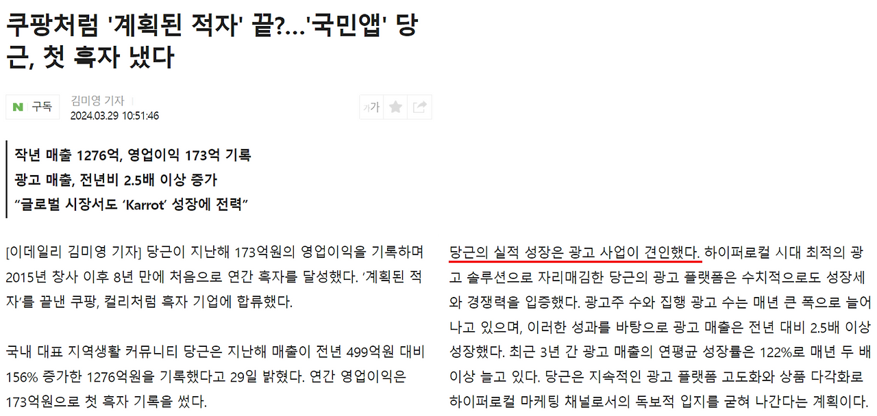 광고 수익은 어떻게 보면 캐시카우다. '오늘의집' 뿐만 아니라 '당근' 또한 광고 사업을 확장했다. 23년 흑자를 달성한 '당근'의 실적 성장을 광고 사업이 견인했다는 것이다. (아래 기사 내용 참고) 21년 쿠팡이 아마존 출신 광고 마케팅 전문가를 부사장으로 스카우트한 것도 이런 이유일 것이다.