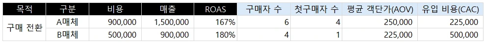 비용 측면에서 어떤 것이 효율이 높았다고 볼 수 있을까요? (재구매 비율까지 확인해야겠지만)100만원으로 20명 구매 고객을 발생시킨 2번일 것입니다.
