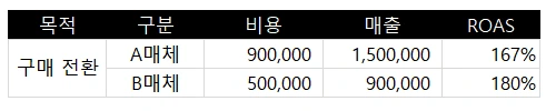 예를 들어 ROAS를 성과 기준으로 본다고 가정하겠습니다. 아래 표1과 같이 A매체와 B매체 결과를 비교해보면 B매체가 성과가 좋았다고 할 수 있습니다. 정말 그럴까요?