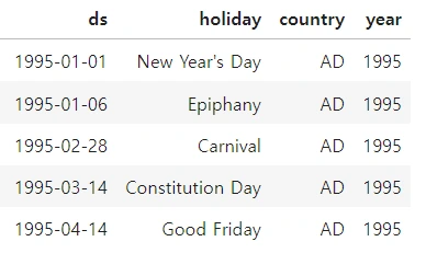 베이지안 오픈소스 라이브러리인 "Prophet"을 활용하여 메타에서 제공하는 데이터다. 59개국의 휴일, 국가별 이벤트 데이터가 들어가 있다고 한다. (한국 데이터도 들어가 있을듯..) 만약 원하는 이벤트 데이터가 없다면 수동으로 넣으면 된다.