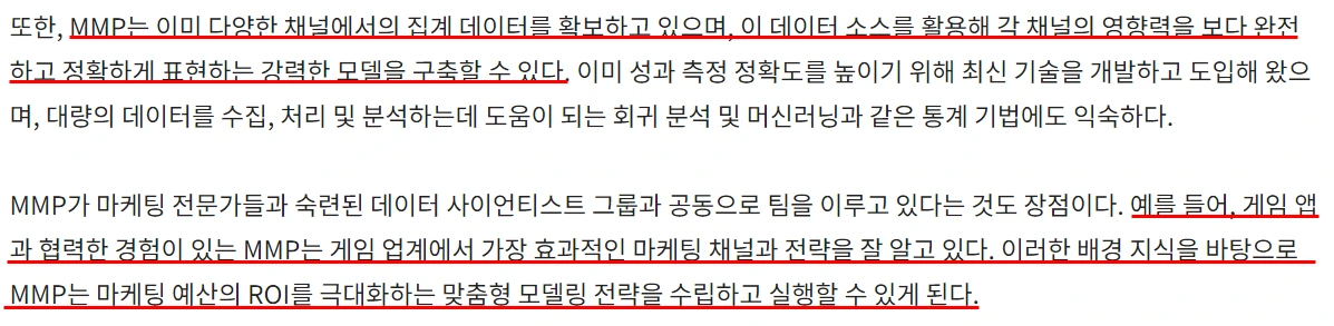 회사 내 데이터팀이 갖춰쳐있고 활용할 수 있는 데이터가 방대하다면 메타 MMM을 쓰는 것이 나을 듯하다. 그러나 만약 회사에서 MMM 사용하라는 지시가 떨어졌는데 데이터팀이 없어 담당할 사람도 없고 데이터 양도 방대하지 않은 편이라면 메타 MMM을 도입한 대행사의 도움을 받거나 솔루션 서비스(예: AB180 자체 구축한 MMM 솔루션)를 이용하는 게 낫다고 본다.