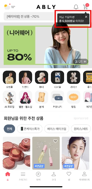 에이블리는 앱에서 장바구니에 상품을 담고 재방문했을 때 장바구니 아이콘에 "지금 구매하면 ~원을 아껴요!"라는 메시지가 노출되었다. 웹에서는 별다른 인웹메세지가 노출되진 않았다.