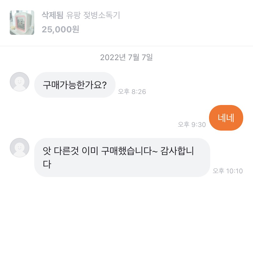 젖병 소독기를 중고로 팔려고 당근에 내놨다. 구매하고 싶다는 연락이 왔는데, 아기를 보느라 한시간 뒤에 답을 했더니 이미 다른 물건을 샀다는 답이 왔다. 불과 한시간만에 거래가 불발되다니 너무하잖아!라는 생각이 들었다. 꽤 오랫동안 판매가 되지 않던 물건이라 더 아쉬웠다.