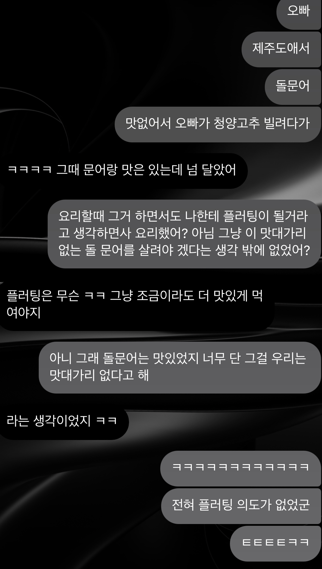남편에게 그날 맛대가리 없던 돌문어 요리를 살린 행동이 약간의 플러팅을 의도한 것이냐고 물어봤다.