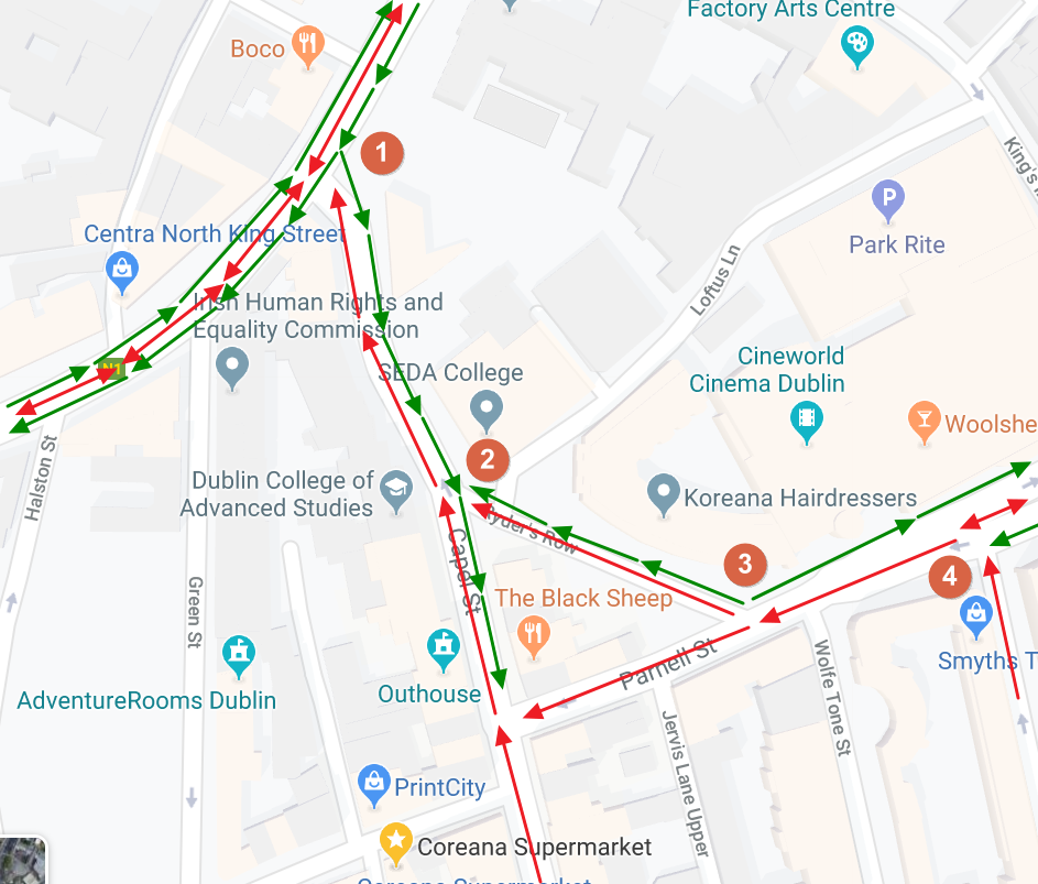 - 자전거 도로가 있지만, 너무 대충 오래된 건지 대충만든건지 끊겨 있는 구간도 매우 많고, 특히 설계가 아예 잘못되어있는 곳도 봤다. 더블린1 아일락쪽에서 더블린7 아버힐로 넘어가는 구간이 있는데, 이 구간은 시티센터라 사람이 엄청 많은 지역임에도 불과하고 도로가 너무 신기해서 한참을 번갈아 보면서 어디가 잘못된건지 되짚어보기도 했다.