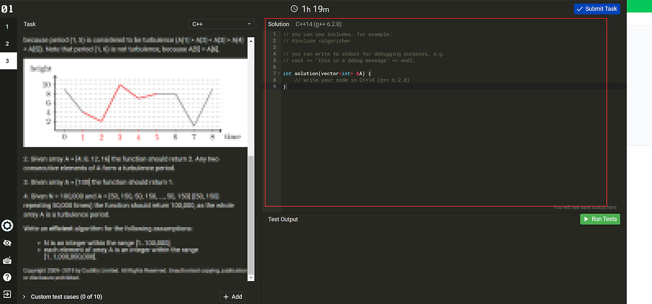 물론, 담당자에게 언제든지 물어보라고 했으나, 최종 보내준 링크가 C, C++로만 작성이 가능하게 되어있는 걸로 봐서 C++로 테스트에 임했다. C++를 안 쓴 지 너무 오래돼서, 며칠 동안 다시 벼락치기로 공부했다. 5 워킹 데이 안에 테스트를 시작하면 되었으나, 갑자기 알고리즘 공부를 열심히 하는 바람에 두통으로 고통받기 싫어서 이틀 째 되는 날 시작 버튼을 눌러버렸다..