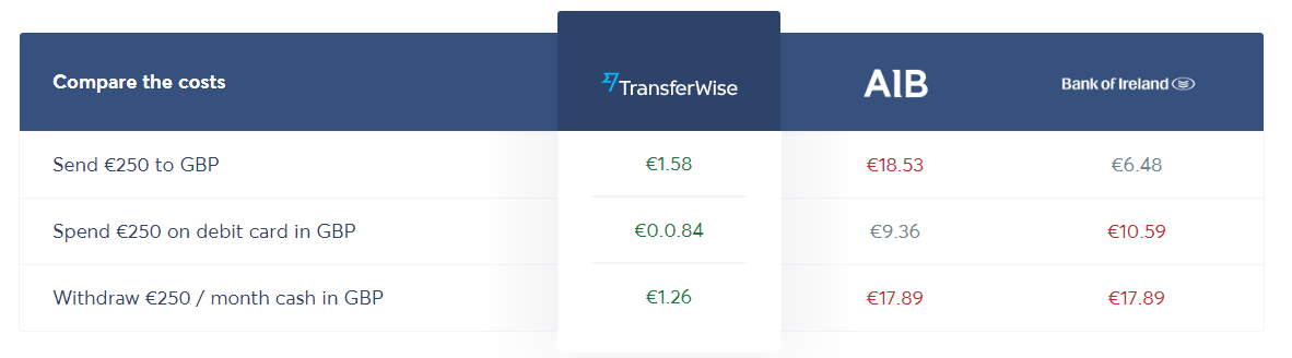 다음은, Transferwise쪽 다른 거래 시(보내기, 카드소비, 출금) 테이블이다. 아일랜드에 살면서는 유로와 파운드 간 전환이 많은 편인데, AIB, BOI를만 쓰기에는 너무 손해인 부분이 많은 것 같다.