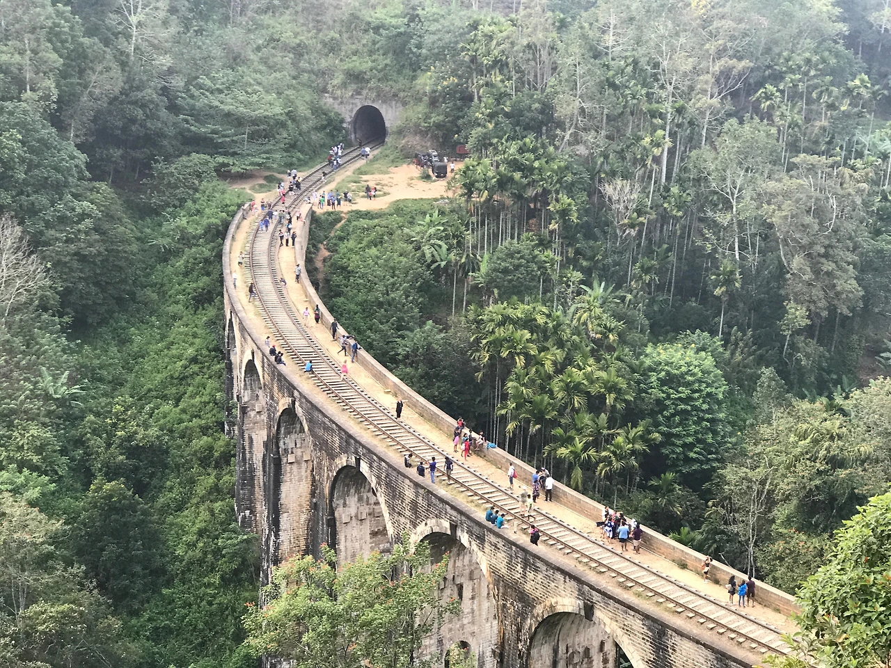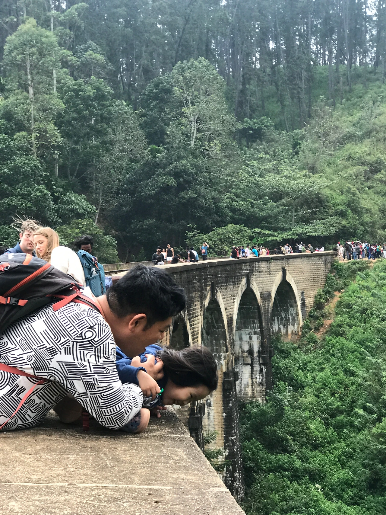 립톤씻에서 내려와 엘라로 가는 오후행 기차를 탔다. 나인아치브리지를 보러 가기 위해서다. 기차역에서 오토릭샤를 타고 나인아치브리지에 데려달라니까, 근처까지 와서는 내려서 걸어가야 한다고 했다. 한 30분 간을 좁은 비탈길, 산길을 내려갔다. 내려갈 때는 남편이 둘째를 안았다. 올라올 때는 남편이 첫째를 안아야 해서 내가 둘째를 안았다. 걷다가 중반쯤 왔을 때 본 나인아치브리지는 거대하고 웅장하고 아름다웠다. 깎아지른 절벽처럼 느껴졌으며, 거기에 사람들이 주렁주렁 매달려 있는 것처럼 보였다. 또 그 브리지를 둘러싼 거대한 숲은 정글숲처럼 보였다.