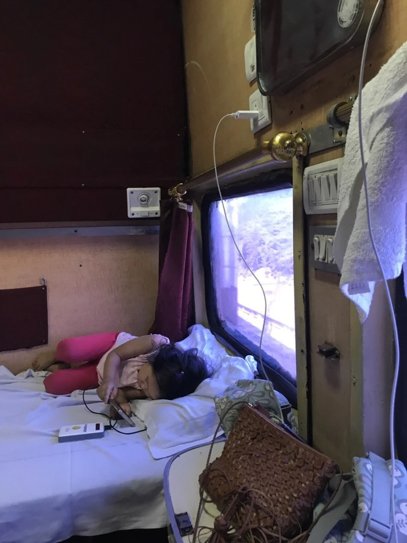 그리고 조드푸르로 향하는 기차를 탔다. 1등석 기차는 침대처럼 되어 있어서 편하게 누워서 갈 수 있다. 기차 안에서 호기심으로 식사를 주문해 봤는데, 이렇게 나왔다. 그럭저럭 먹을 만했다.