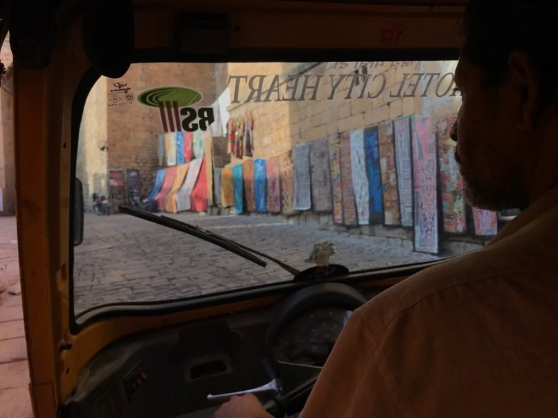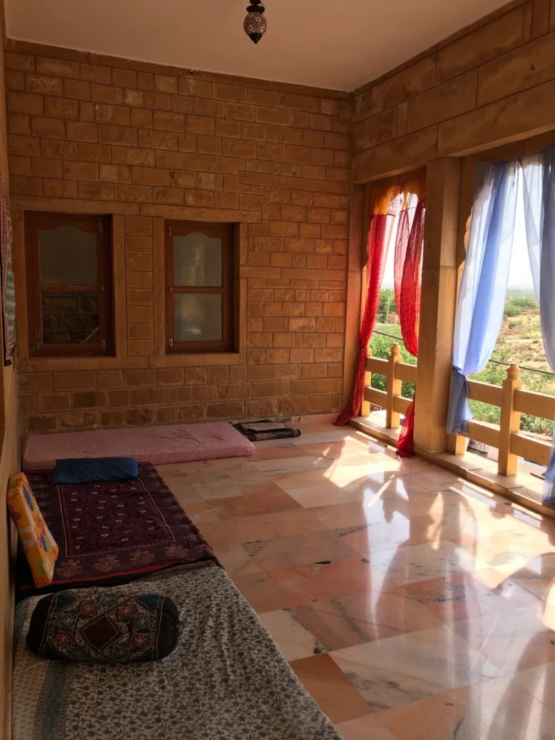 우선, 첸나이에서 자이푸르까지 비행기로 이동하고, 자이푸르에서 자이살메까지 프로펠러 비행기를 탔다. 프로펠러 비행기는 통로를 기준으로 좌석이 두 개씩 있는, 아주 좁고 불안정한 비행기다. 약 한 시간을 비행했는데, 달달달달 소리가 나고, 자꾸 흔들려서 자이살메르까지 제대로 도착할 수 있을지 너무나 두려웠다. 자이살메르가 가까워지자 하늘 아래는 온통 모래뿐인, 삭막한 땅이 보였다. 우리는 자이살메르 공항에 내리자마자 숙소로 이동했다.