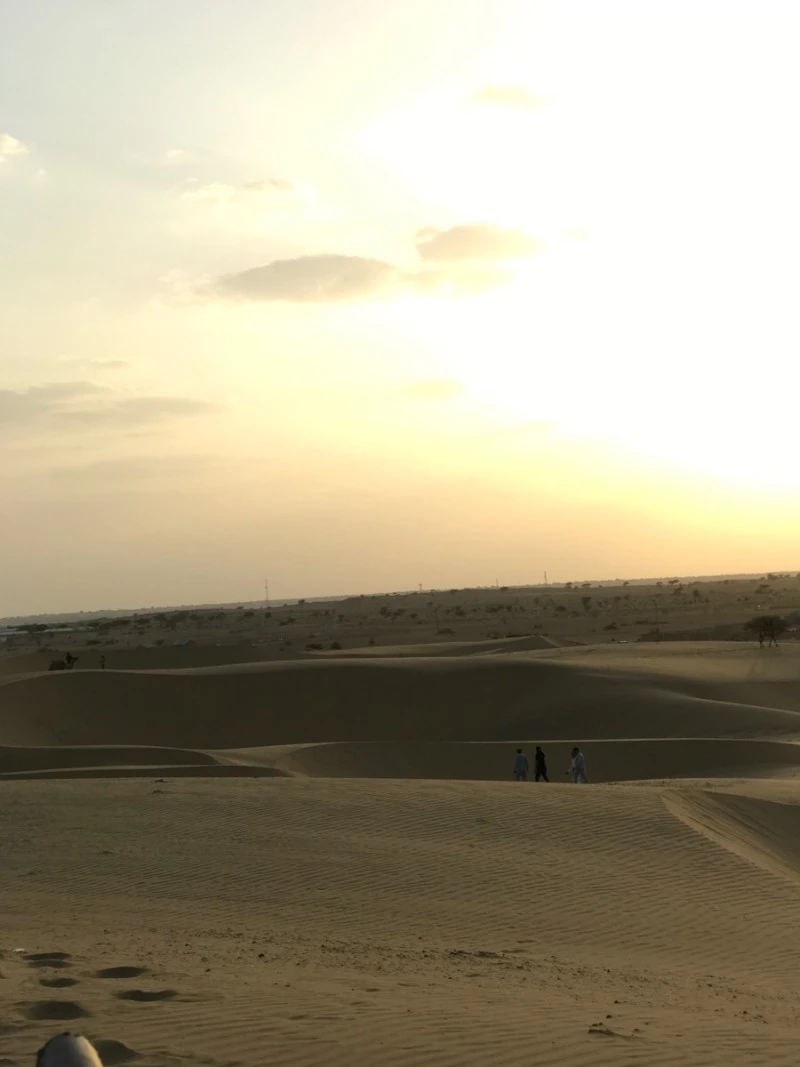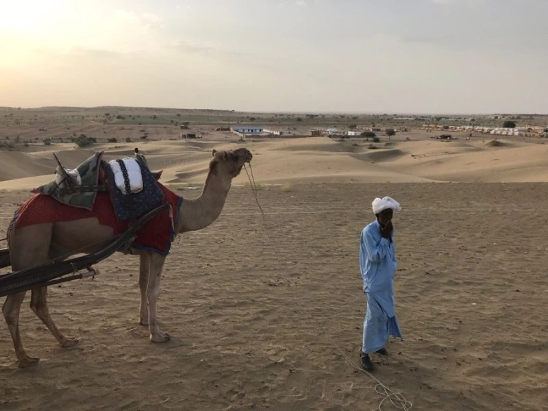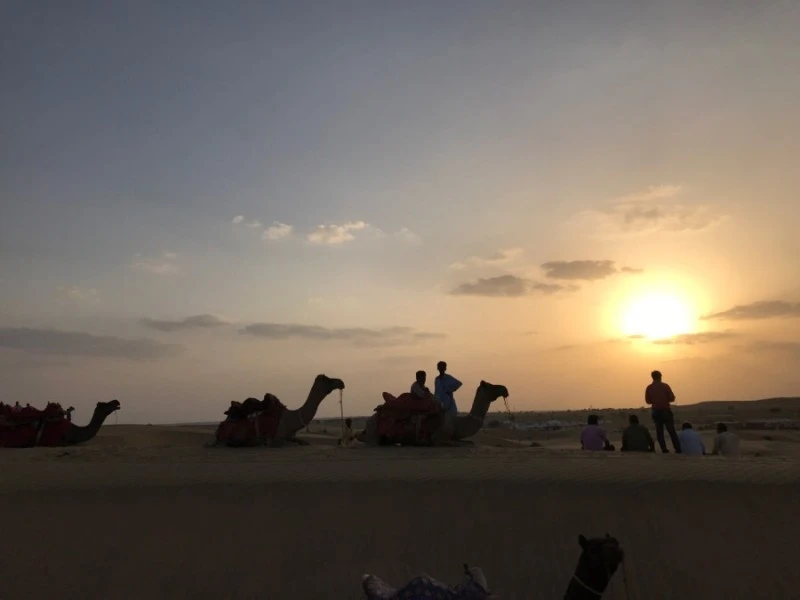 그들의 친절함에 감사한 마음이 드는데, 갑자기 태도가 돌변했다. 여기까지가 무료체험이고 샘샌드튠즈까지 가려면 750루피를 더 내야 한다고 했다. 우린 무료라고 알고 왔는데 돈을 더 내는건 할 수 없다고 하자 그럼 돌아가야 한다고 했다. 그럼 돌아가겠다고 했더니, 300루피만 내라고 한다. 그러고 싶지 않았다. 그때, 우리 옆으로 낙타가 이끄는 카트가 다가왔다. 첫째가 카트를 타고 싶다고 했다. 그래서 500루피를 내고 카트로 갈아탔다. 우린 낙타가 이끄는 수레에 올라타 지는 해를 등지고 달려서 사막 한가운데에 도착했다. 우리를 태워준 낙타몰이꾼은 낙타를 이끌고 쓸쓸하게 돌아서 갔다.
