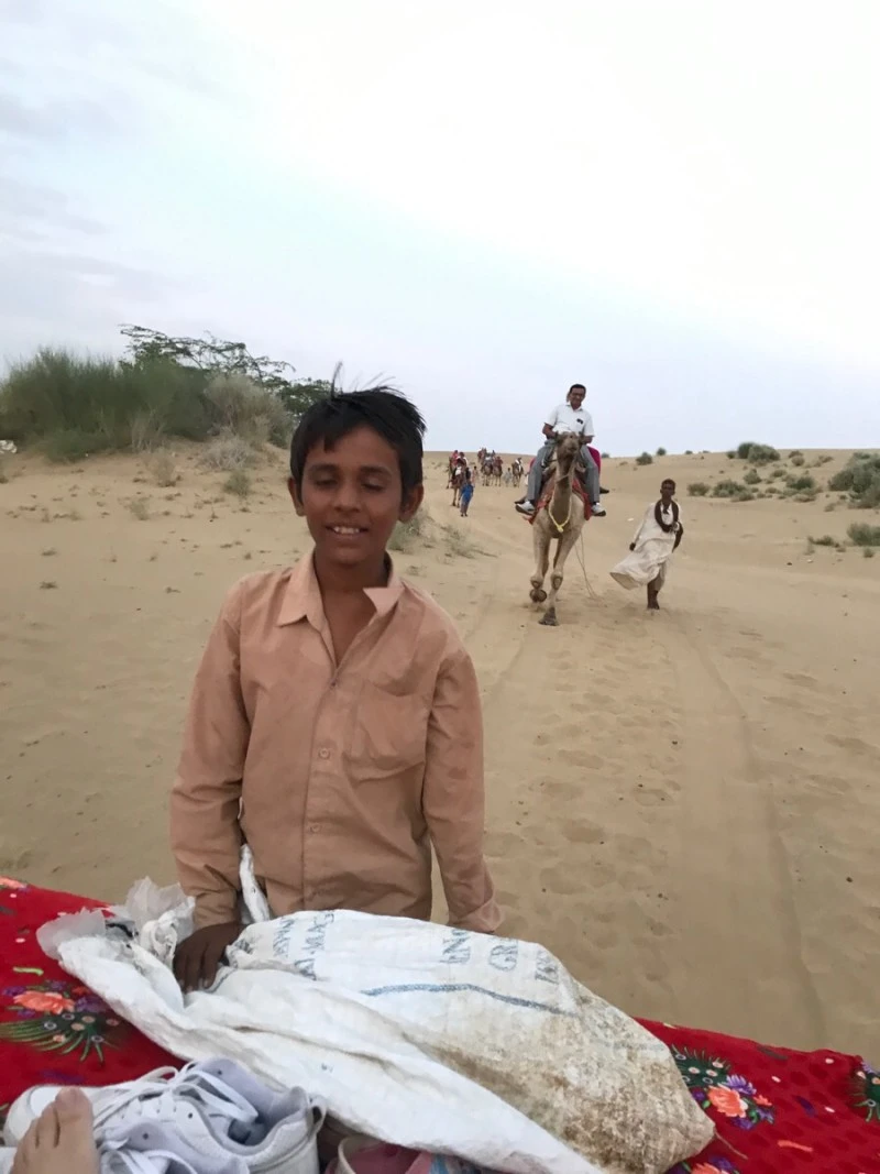 지프차를 예약할지 고민하고 있는 찰나, 매니저에게 전화가 왔다. 우리가 예약했던 상품에 낙타체험이 무료로 포함되어 있다는 거다. 숙소 앞에 나가 있으니, 인도인이 낙타 두 마리를 끌고 왔다. 나는 첫째를 안고, 남편은 둘째를 안았다. 낙타의 키가 보는 것보다 크다는 사실에 깜짝 놀랐다. 처음에 낙타가 일어설 때 고꾸라질 것 같아 비명을 질렀는데, 조금 걷자 안정감이 들어서 주변을 둘러보는 여유가 생겼다. 우리의 뒤를 따라 줄을 이어 다른 낙타들이 걸어왔다. 또 맞은 편에서는 돌아오는 낙타들도 있었다. 서로 손을 흔들었다. 외국인이라고 유독 반가워 해주었다. 즐겁게 샘샌드튠즈를 향해 가는 중, 낙타몰이꾼이 여기가 뷰 포인트라며 내리자고 했다. 사진도 찍어주겠다고 했다.