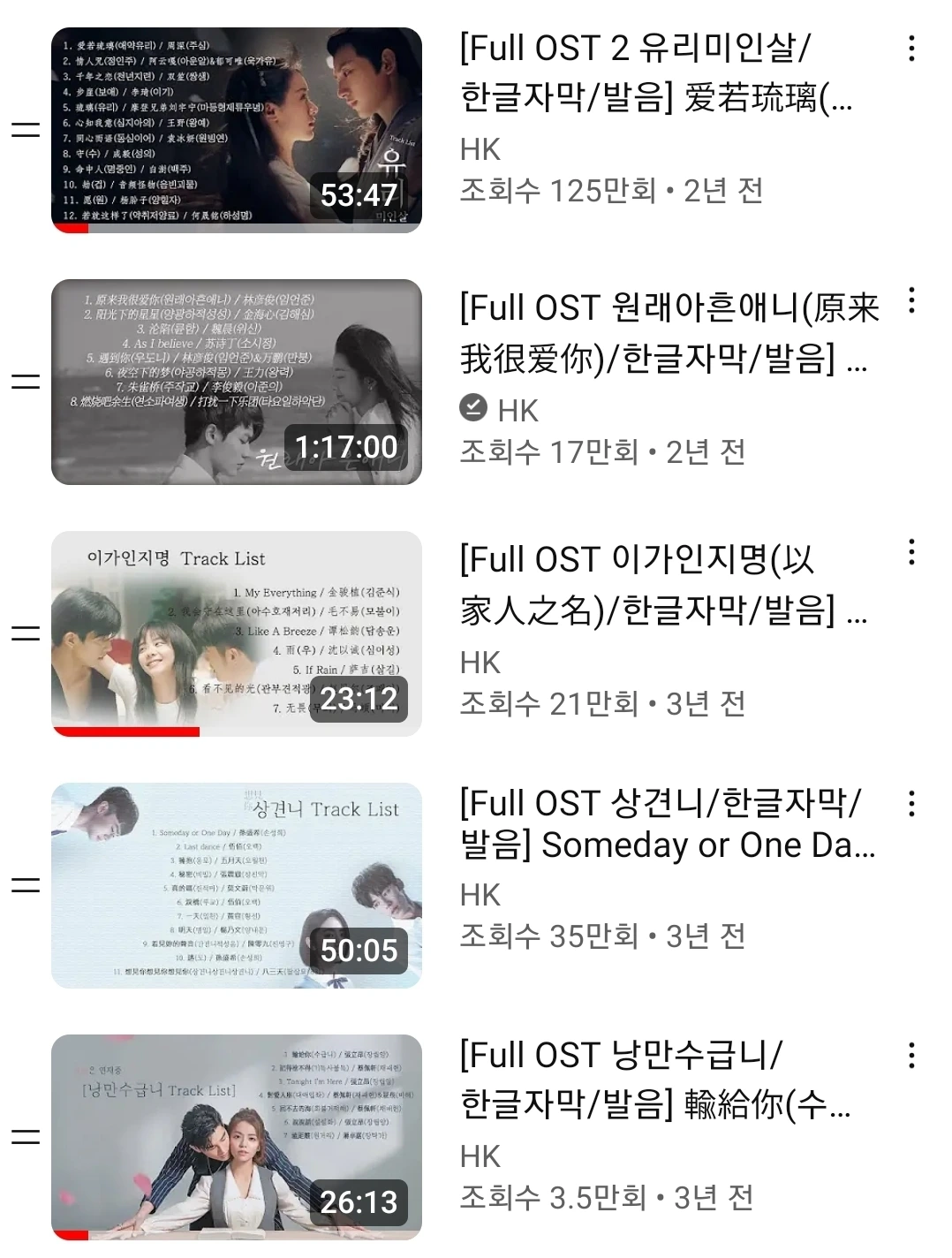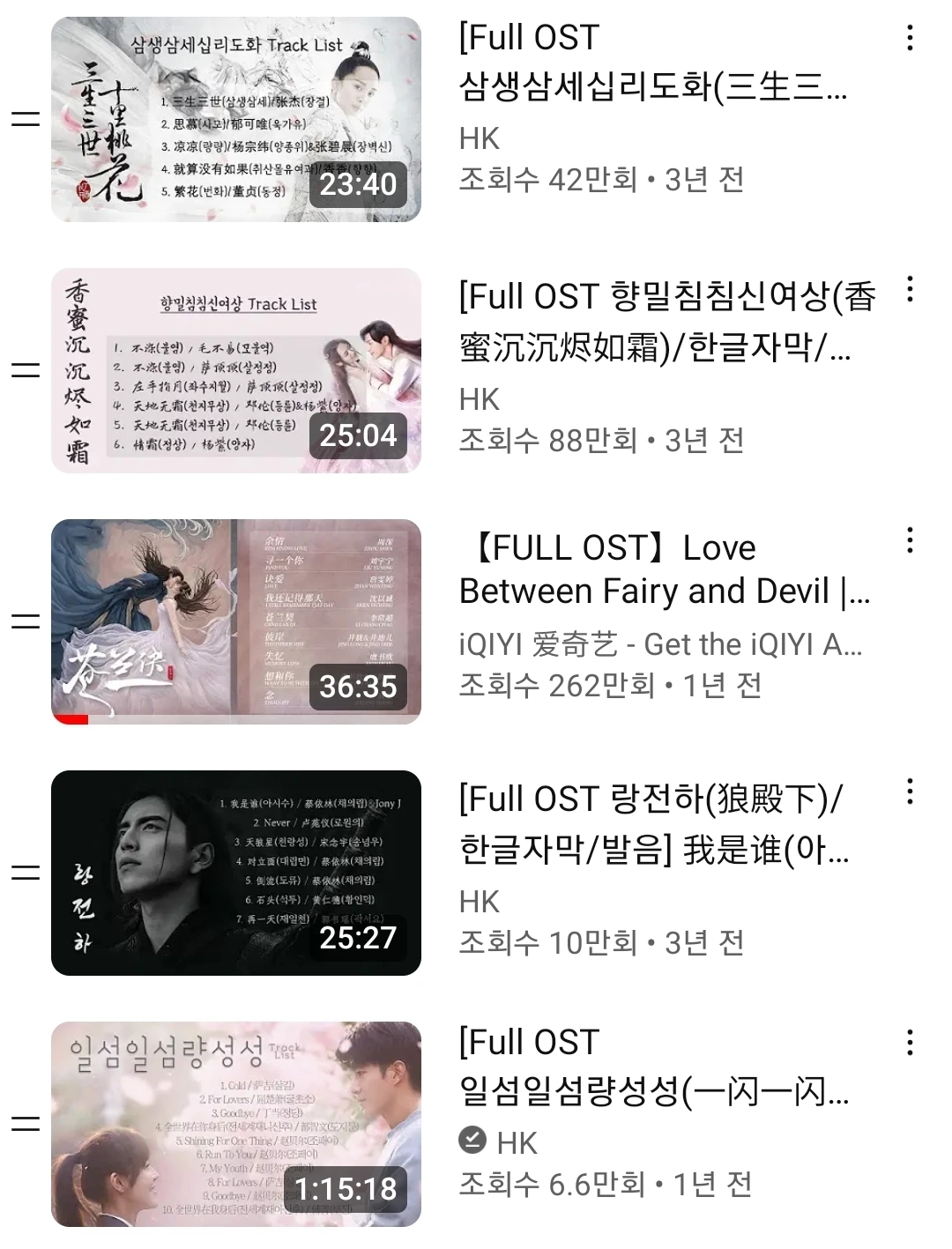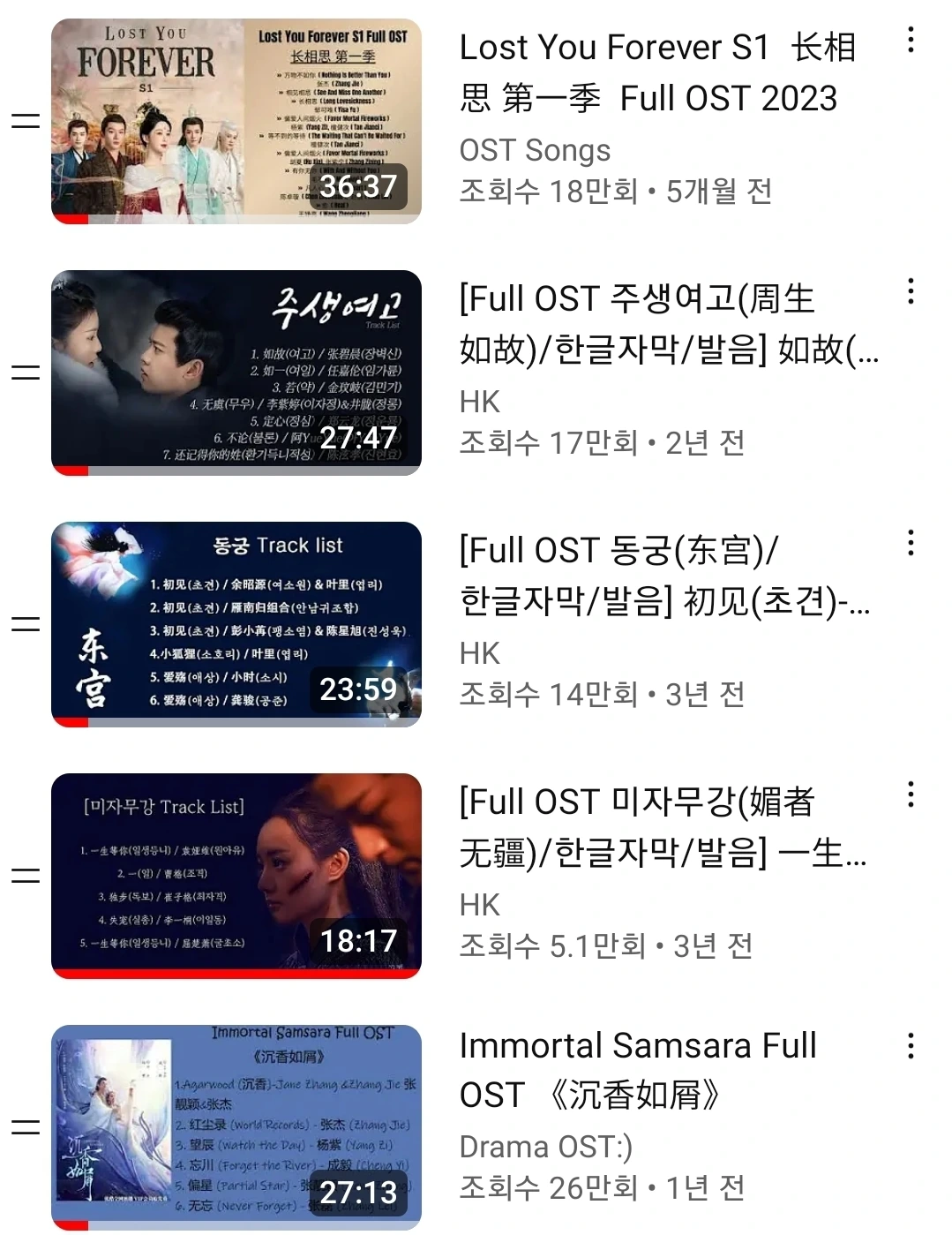 당시에 푹 빠져서 봤지만, 새로운 드라마를 발견하면 금세 다른 것에 빠져들었다. 하지만 드라마가 떠난 자리에 음악이 남아서, 노래를 들을 때마다 마음속에 박혀 있던 장면이나 대사들이 툭툭 튀어 올라온다. 그것은 내게 행복한 추억이다. 중드 덕분에 좋은 노래를 많이 알게 되었고, 더불어 중국어 공부의 동기부여까지 되었으니, 일석이조가 아닌가.