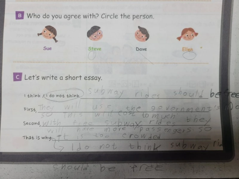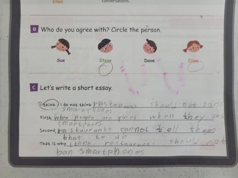Debate를 통해 자신의 생각을 말할 수 있게 되었다. 자신의 관점에서 주장과 근거를 적고, 그걸 말로 표현해 보는 과정까지 기록으로 남겼다. 동영상에 아이가 발표하는 모습을 담아서 밴드에 올리면 그중에 세 명씩 뽑아 선물을 주기도 했는데, 아이가 몇 번 뽑히자 의지가 샘솟았다.