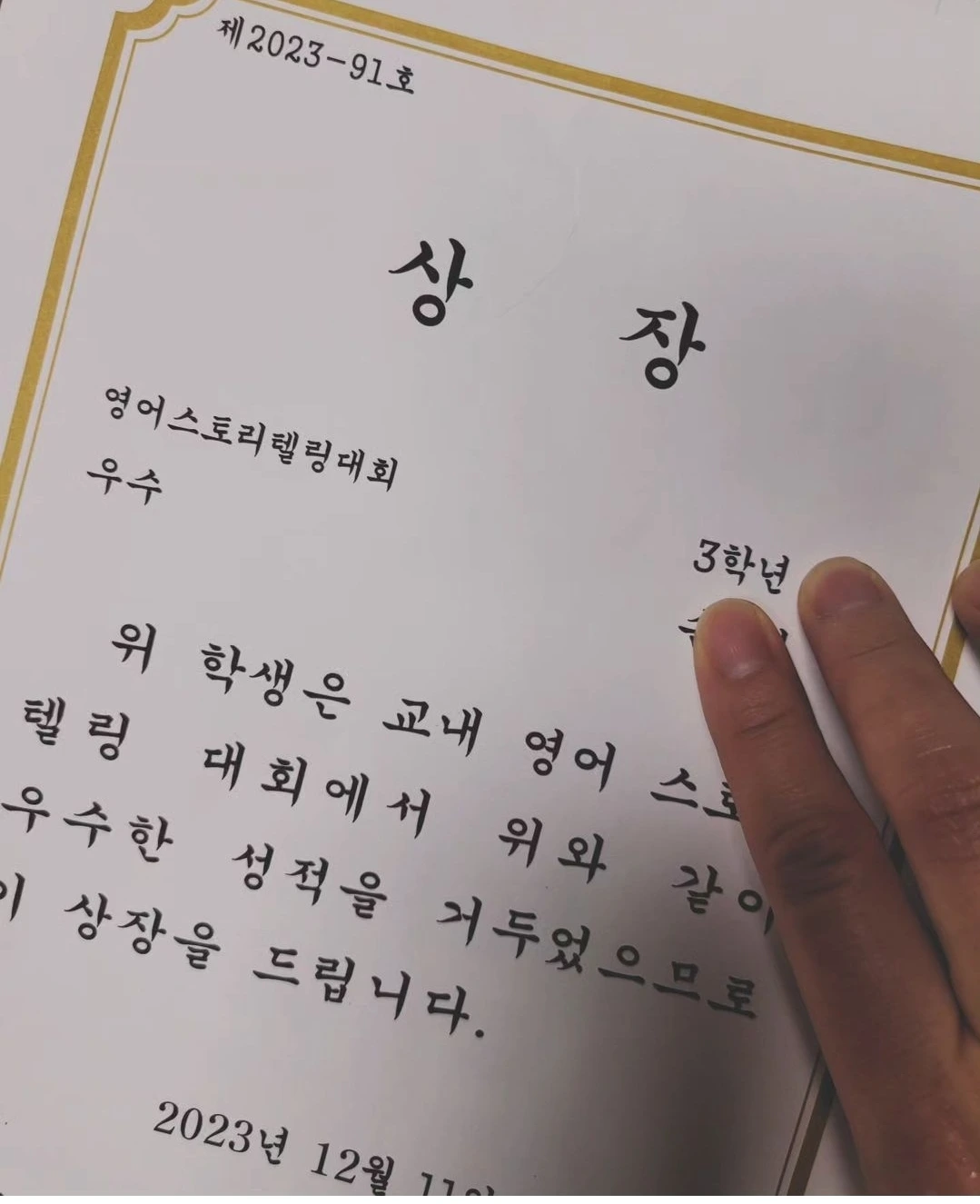 또, 단순히 기사를 낭독하는 것만이 아니라, 일주일에 한 개씩 기사를 외우기도 했다. 아이는 외우는 거를 자신 있어했고, 이런 자연스러운 연습과정은, 3학년 가을에 있었던 영어스토리텔링말하기 대회에서도 빛을 보게 되었다.
