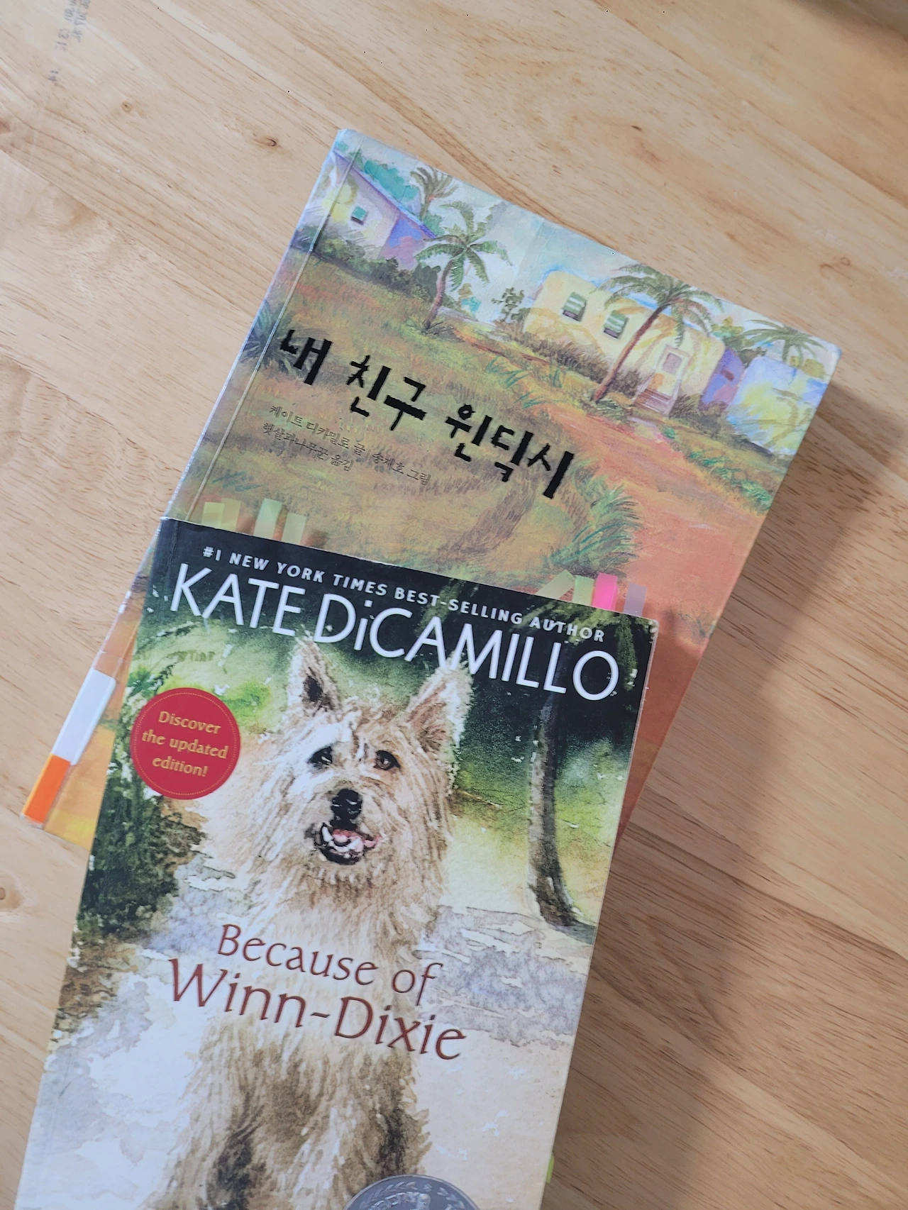 얼마 전에 케이트 디카밀로의 번역서《내 친구 윈딕시》를 읽었기에, 뉴베리 수상작인 《Because of Winn-Dixie》를 들이밀었다. 작년부터 읽히고 싶어서 기회를 보아왔던 책인데, 그림도 없고 글자만 있다며 아이가 거부했었다. 하지만 행간이 넓고 페이지에 글자수도 많지 않아서 도전해 볼 법하다고 생각했다. 한글책을 읽고 나서 자신감이 생겼는지 청독으로 읽어보겠다고 했다. 그래서 매일 두 챕터씩 읽고 있다.