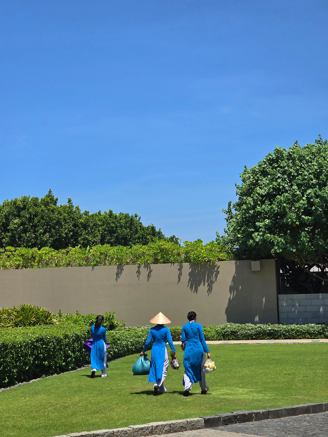 베트남의 한 리조트에서 배달시킨 음식을 기다리는데, 땡볕을 피해 그늘 속에 들어와 있는데, 게이트를 지키는 직원과 눈이 마주친다. 그가 웃으며 먼저 인사를 하고 나도 같이 웃으며 인사를 한다. 파란 아오자이를 입은 여성 세 명이 양손 가득 짐을 들고 있다. 셋은 즐겁게 웃으며 빠르게 걸어왔다. 갑자기 바람이 훅 불어와 한 명이 쓰고 있던 베트남 모자, 농이 날아갔다. 게이트를 지키는 직원이 여성에게 농을 씌워준다. 둘 다 웃고 있다. 나도 웃는다. 뜨거운 태양 아래, 하늘과 바다와 여성의 아오자이가 모두 파랗게 우리의 웃음에 걸려 있었다. 같은 옷을 입은 세 여성의 뒷모습을 바라보는데, 아름다움은 자연스럽게 스며드는 것이라고,