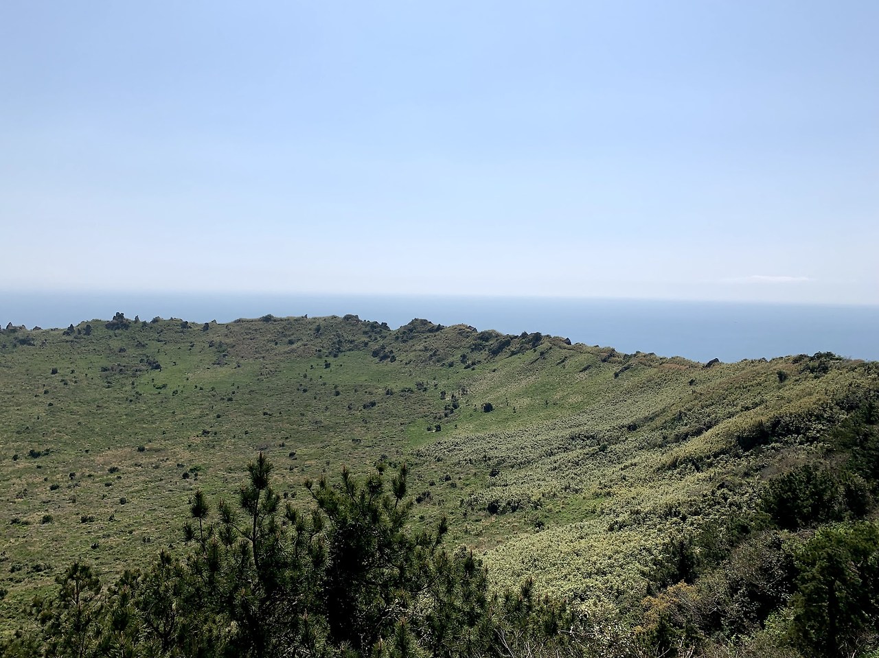 성산일출봉은 멀리서 보기만 했지, 진짜 올라본 것은 처음이었는데 역시나 입구부터 수학여행 관광버스, 중국인 단체 관광객까지 몹시 붐볐다. 딱히 올라보고 싶었던 생각이 없었던데다 미운 아빠가 그토록 가자하니 더 싫었던 터, 붐비는 인파에 한숨을 푹푹 쉬며 오르기 시작했다. 가파른 계단은 팝업북마냥 자꾸만 나타났고 이제는 한숨 대신 턱 밑까지 차오르는 가쁜 숨에 허덕였다. 겨우겨우 정상에 앉아 크고 푸른 국그릇을 바라보았다. 사람의 손길이 닿지 않은 자연 그대로의 분화구는 성산일출봉만을 대차게 외치던 아빠에 대한 작은 원망을 집어삼킬 만큼 시원하고 관대한 풍경이었다.