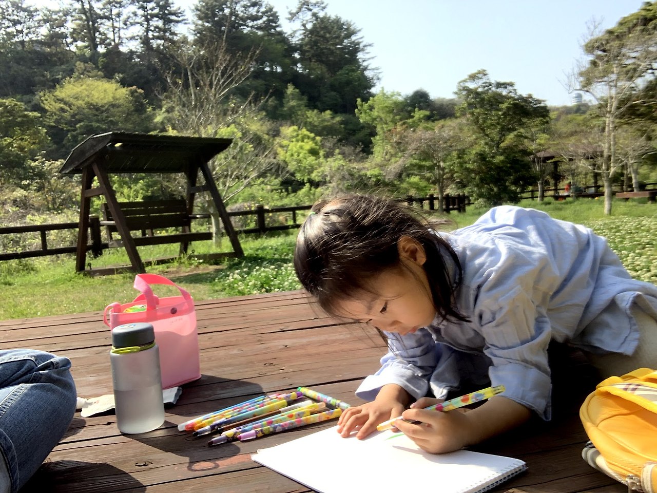 과자 부스러기를 조금 흘려 개미들의 영차영차 협동 대작전을 관찰한다. 돌멩이로 잎을 빻아 시금치나물을 만든다. 챙겨 온 색연필을 꺼내 그림을 그린다. 그림의 주제는 '건강에 좋은 것' 이란다. 건강에 좋은 것은 알지만 절대 먹지 않는 당근, 브로콜리, 깍두기(?)따위를 열심히 그린다. 집에서는 절대 할 수 없는 '온 체중을 담아 발구르기'에 303호 층간소음 유발자는 까르르 웃음이 터진다.