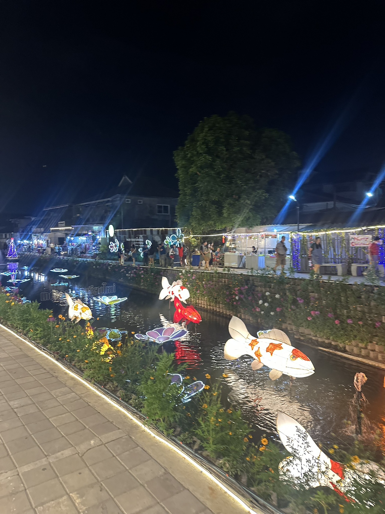 우리는 또 우리의 스케줄을 해야 했다. 집에 돌아와 냉장고 털이로 닭볶음탕을 해 먹었다. 반조리 제품이라 30분도 안되어 저녁을 해치우고 택시를 불러 크렁메카로 향했다. 이곳은 한국인들이 많이 가는 곳은 아니고 청계천 느낌의 현지 데이트 장소 같은 곳이라고 했다. 엄마랑 나는 술을 마시지도 않아 저녁에 마땅히 즐길거리가 없었기에 여기가 적합하다고 생각했다. 지난번 한달살이 숙소 근처여서 눈에 익은 골목이 나와 반가웠다. 예전에는 아기들이 마이크와 스피커를 들고 나와 노래도 부르고 활기찼던 것 같은데 그보다는 덜 북적였다. 그래도 하천을 따라 정돈된 꽃들과 조명들이 멋졌다. 이곳은 주민들이 진짜 사는 곳이고 집 바로 앞에서 장사를 한다. 초등학교 때 이렇게 1층 주택 앞에서 떡볶이 장사를 하던 집이 있었는데 참 맛집이었지.. ㅎㅎ