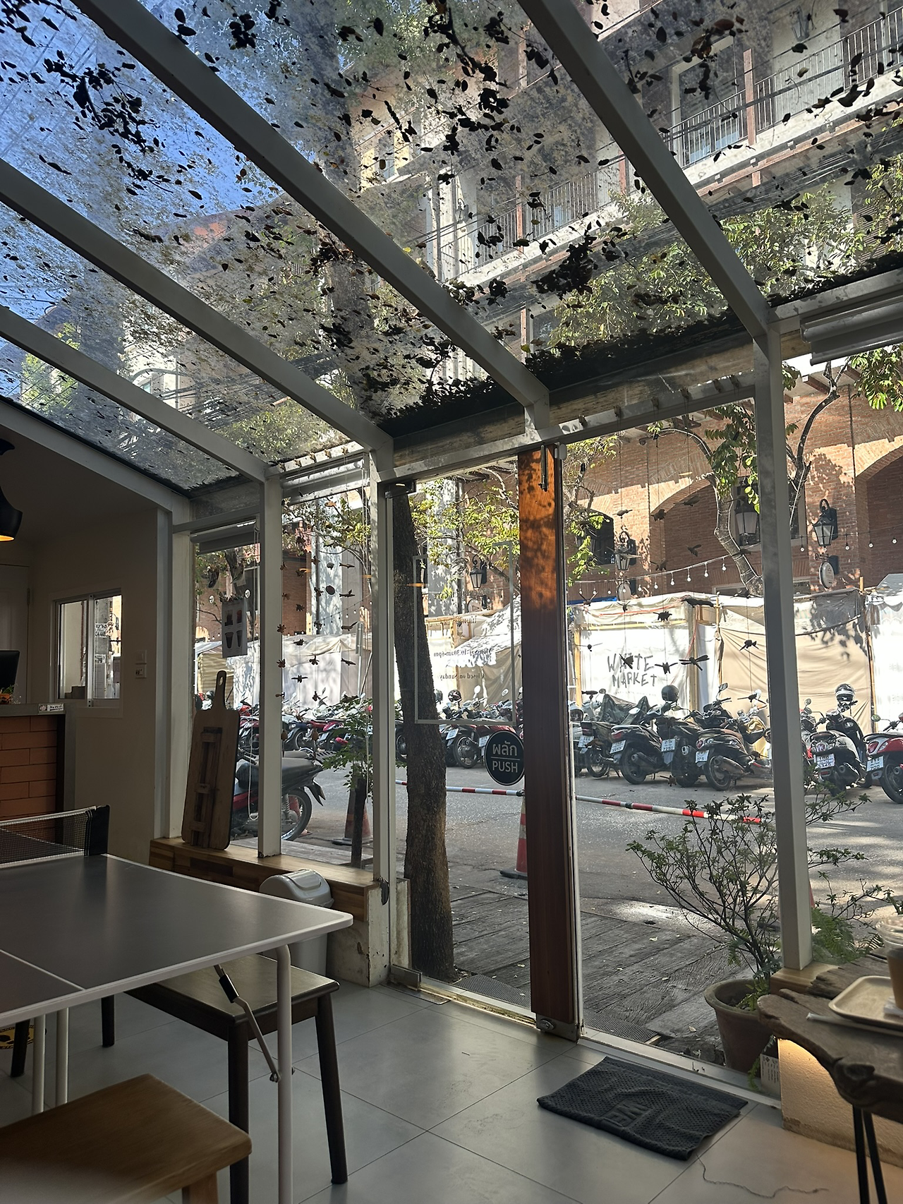 식사 후 과일과 물을 사서 집에 잠시 들렀다. 돌려놓은 빨래를 볕이 좋을 때 널어두기 위해서다. 여기는 매일 날씨가 좋아 빨래가 잘 마른다. 운동복도 매일 빨래를 해서 걸어두니 한벌 씩만 가져와도 될 뻔했다. 오늘은 낮에 올드타운을 나가볼까 했는데 4시에 잡아둔 마사지가 애매하다. 하는 수 없이 카페를 찾아 나서다 원님만 근처 고즈넉한 카페를 찾았다. 와이파이도 안 되는 곳인데 통창 위로 나뭇잎이 걸려 굉장히 운치가 있다. 사람도 적고 커피도 저렴하고. 지도앱에 잘 저장해 두었다가 나중에도 와야겠다.