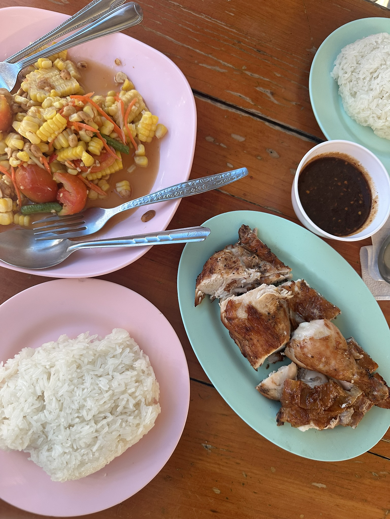 오늘 운동은 엄마와 함께했다. 나는 오늘도 러닝머신 40분을 꼬박 채우고 엄마는 옆에서 스텝을 밟았다. 요즘 제주도에서 라인댄스를 배우시는데 왜 이름이 라인댄스인지는 모르겠다. 원투 차차차 스텝인 거 같은데 아무튼 이 걸로 가끔 동네 발표회도 하고 그러신다. 개운하게 땀을 쭉 빼고 오늘은 어제 유튜브 보다가 나온 로스트 치킨 식당을 가볼 참이다. 숙소에서 250미터 밖에 안 떨어져 있었다. 과연 리뷰대로 연기가 자욱했다. 다행히 자리가 있어 앉았는데 여기는 맛집이라는 타이틀이 무색하게 시스템이 엉망이다. 자리를 안내해 주는 사람도, 주문을 받으려는 사람도 없고 그냥 요리만 하고 있다. 눈치를 보다가 종이에 메뉴를 적어 카운터로 가져다주었다. 물은 또 어디에 있나.. 싶었는데 눈치껏 물통을 찾아 두 잔을 받아왔다. 사람들은 왜 시원한 물을 먹지.. 싶었는데 또 그 옆에 박스에 얼음이 있었다. 후기에는 야채도 가져다 먹을 수 있다고 하는데 야채는 결국 찾지 못했다. 결국 어찌어찌 음식이 나오긴 한다. 로스트치킨 반마리와 옥수수 쏨땀을 시켰다. 이 두 개를 처음부터 먹고 싶었는데 기회가 닿지 않았었다. 결국 먹고 가서 다행이다. 찰밥에 소스까지 곁들이니 담백하고 입맛이 싹 돈다. 아주 마음에 드는 한 끼다. 반 이상이 외국인 같았는데 한국인끼리는 서로를 또 기가 막히게 알아보고는 직원 안 오니까 직접 주문하셔야 한다, 물은 여기 있다, 얼음은 그 옆에 있다. 서로가 서로에게 안내자가 되어준다. 잘 먹었다.