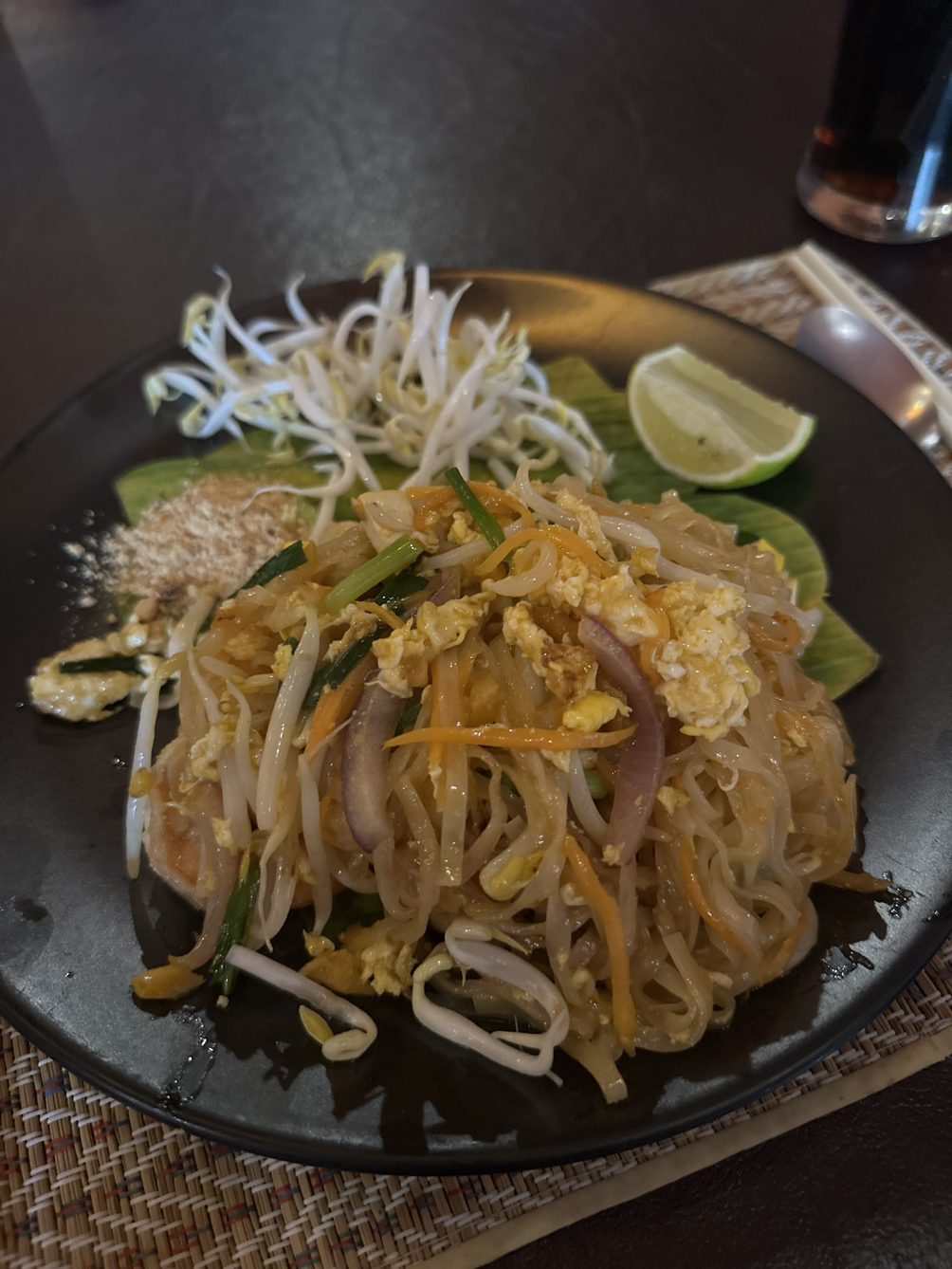 오늘은 이것저것 할 일이 많은 날이다. 짐도 많아 오늘의 카페는 집 앞에 시그니처 카페로 정했다. 가기 전에 점심을 먹어야 한다. 오늘도 어묵국수를 먹으려다가 항상 나오는 반대 방향으로 좀 더 걸어갔는데 고급스러운 태국 음식점이 있다. 구글 평점을 찾아보니 괜찮다고 해서 들어갔다. 유럽 투어팀인지 10명 정도가 두 테이블에 나눠서 앉아있다. 사장님이 굉장히 젠틀하고 친절하다. 가격은 야시장보다 3배 정도 비쌌지만 그래봤자 6천 원이다. 팟타이 하나와 펩시를 시켰더니 잔에 펩시를 정성스레 따라주신다. 맛도 괜찮고 분위기도 좋아서 나중에 서진이와 다시 방문해야겠다고 다짐했다.