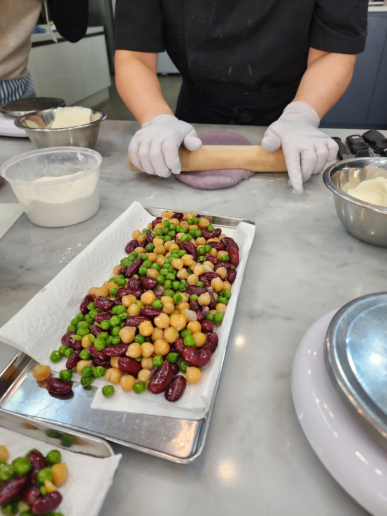 크림소스와 삼색콩에 돌돌말아 대형만두를 연상시키듯 꼬집까지 완성.