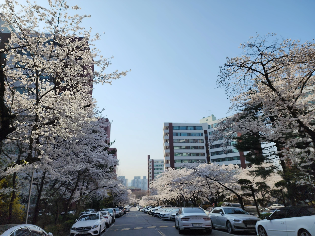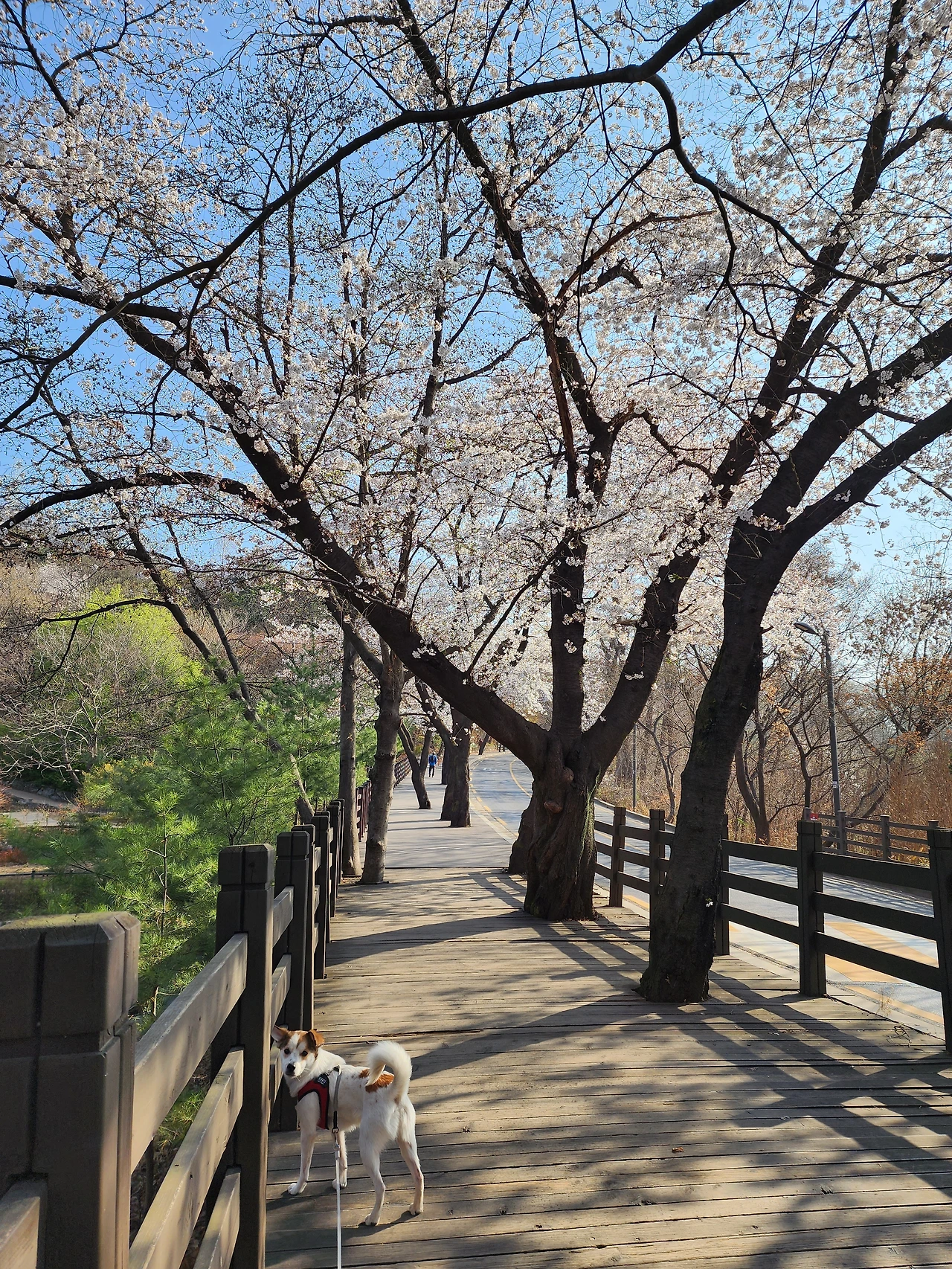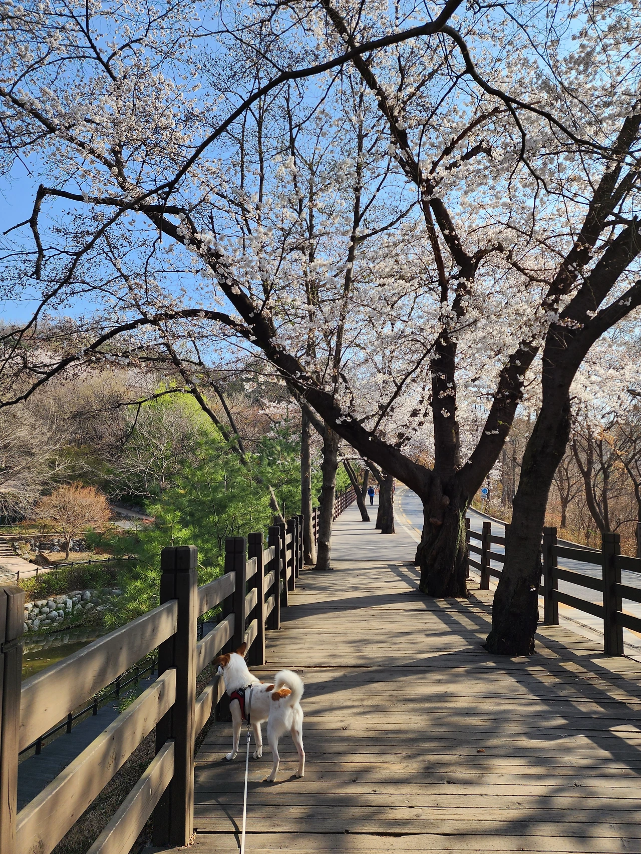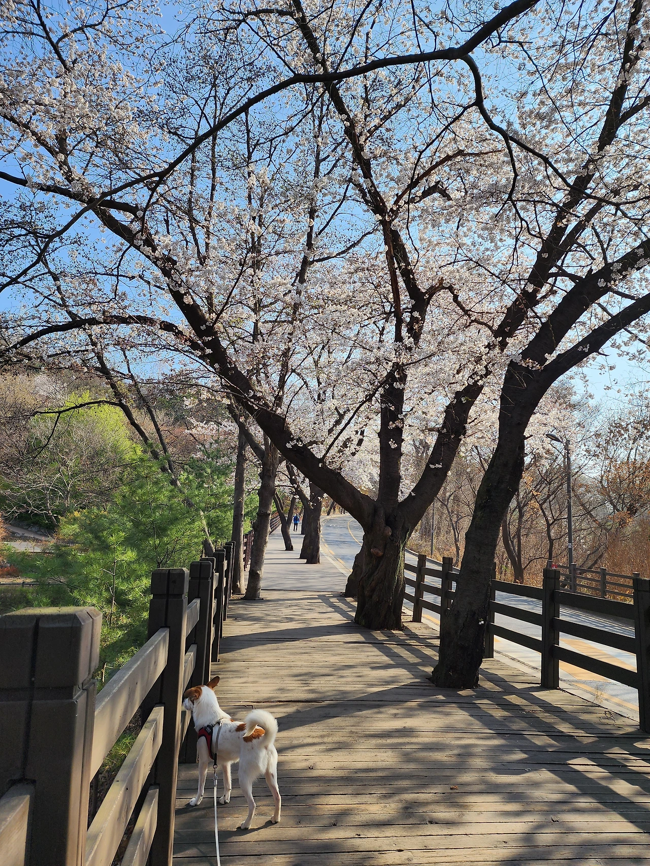 오후타임으로 일이 잡혀서 여유에 사치를 부릴 예정이다. 아침 산책에 반려동물 우유가 있어 더욱 즐겁다. 나무사이로 비치는 아침 햇살에 길가 가로수 벚꽃들이 만발이다. 처음엔 한그루에서 시작 되었던 벚꽃이 마치 도화지에 수채화 물감 물들이듯 번졌다. 불과 3~4일만에 가로수에 핀 벚꽃들에게 감성이 졸부 되었다.