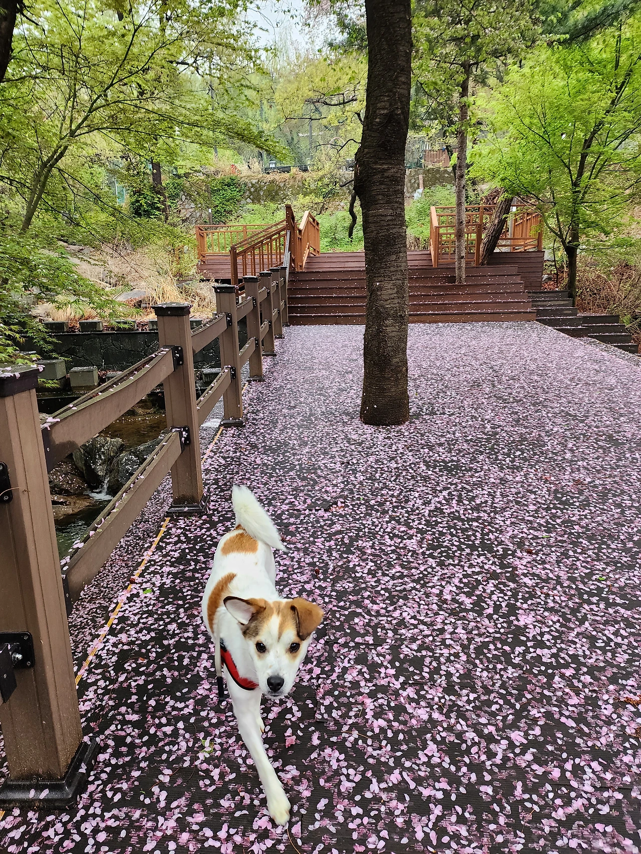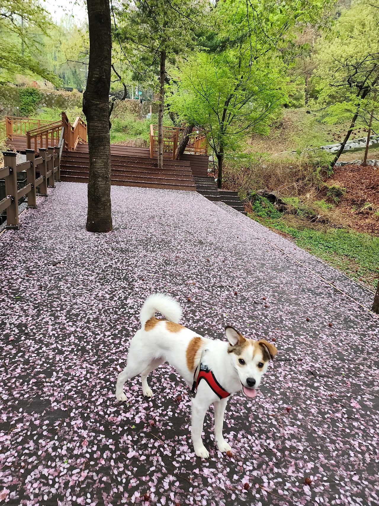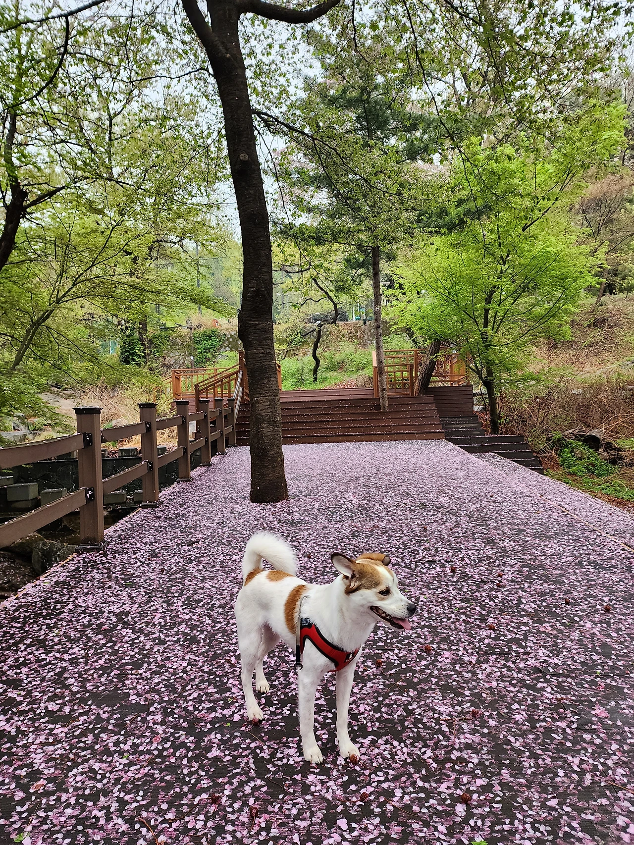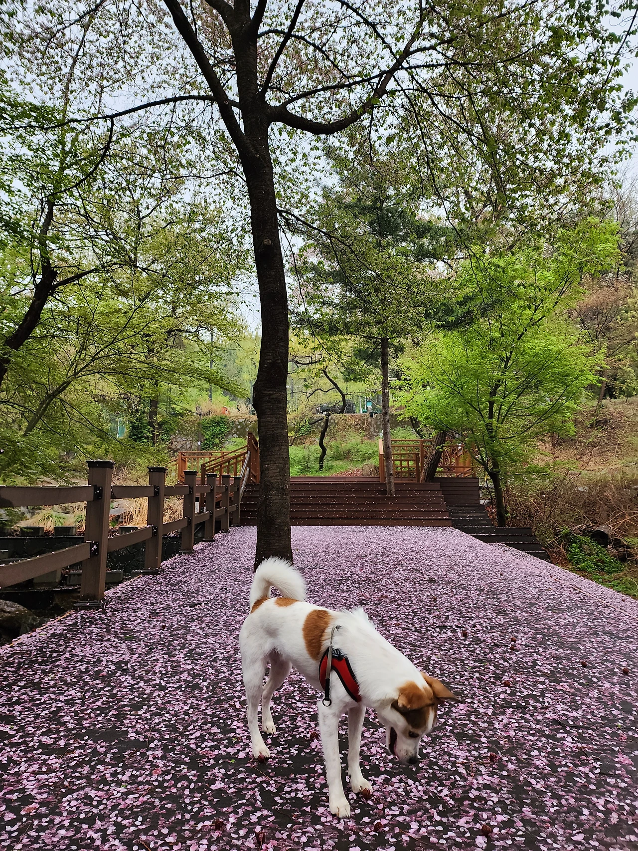 봄비가 선물을 놓구 가셨다. 그것도 내가 좋아하는 핑크색으로 말이다. 소복히 내려앉은 꽃잎들은 또 다른 모습으로 감동을 주었다. 반려견 우유도 신기해 보이는 눈빛이였다.