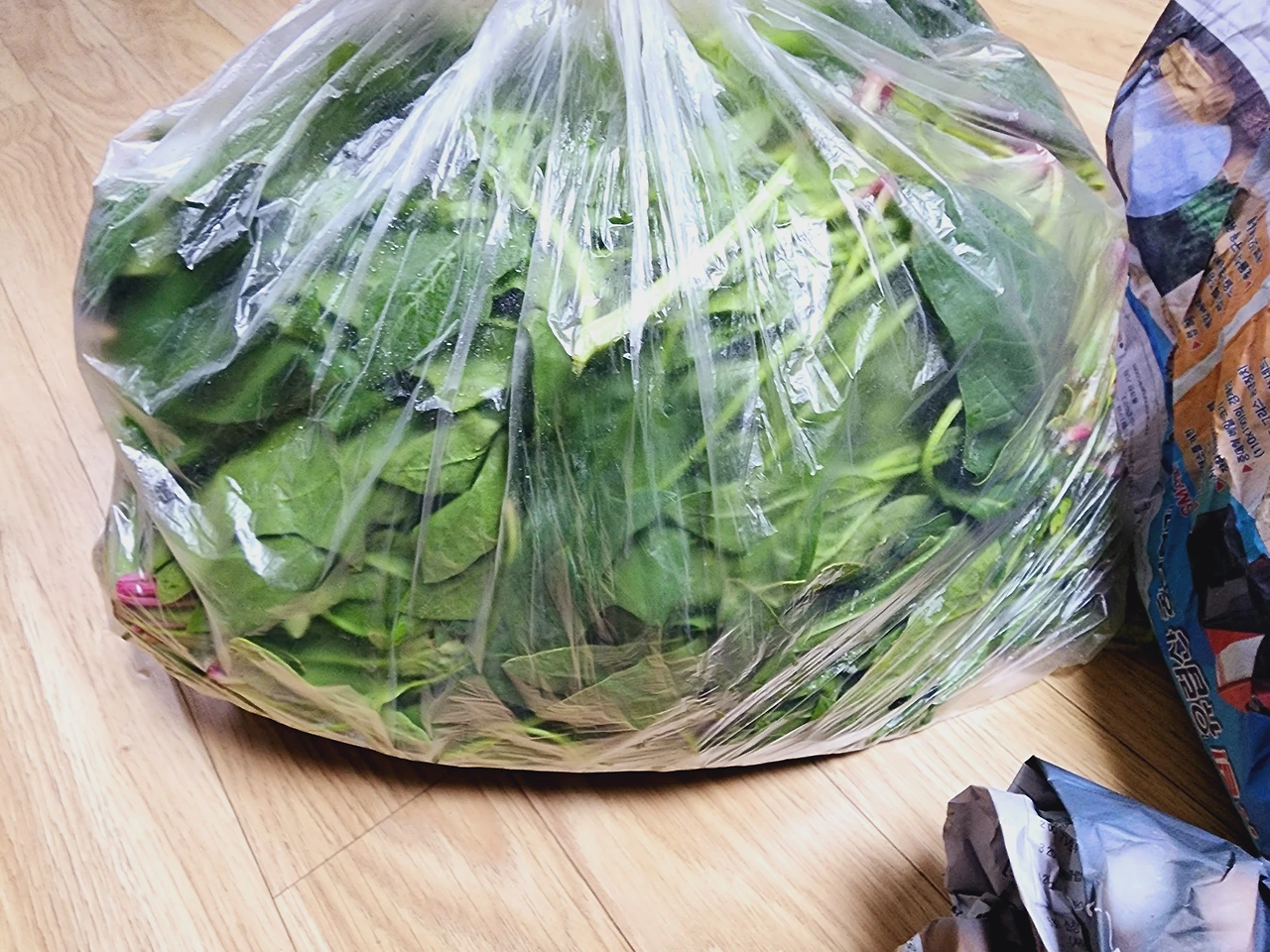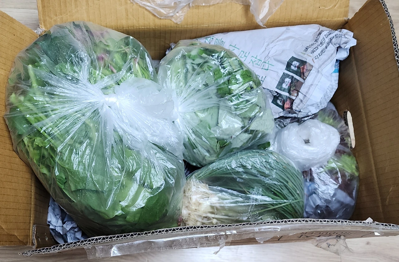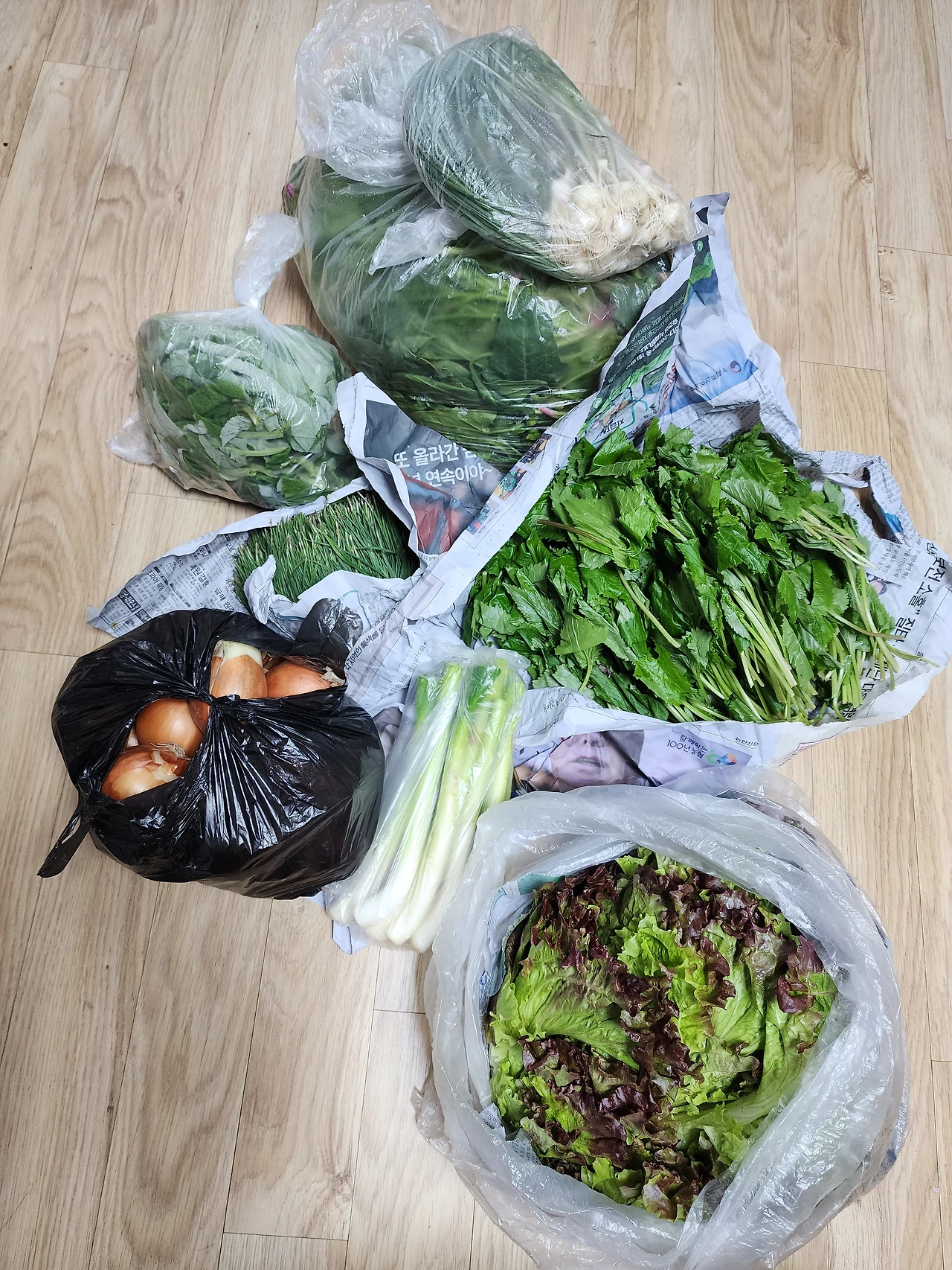 시금치, 상추등은 양이 많아 이웃집들과 조금씩 나눠먹으려고 나눠 담았다. 이를 보던 둘째가 한마디 한다.