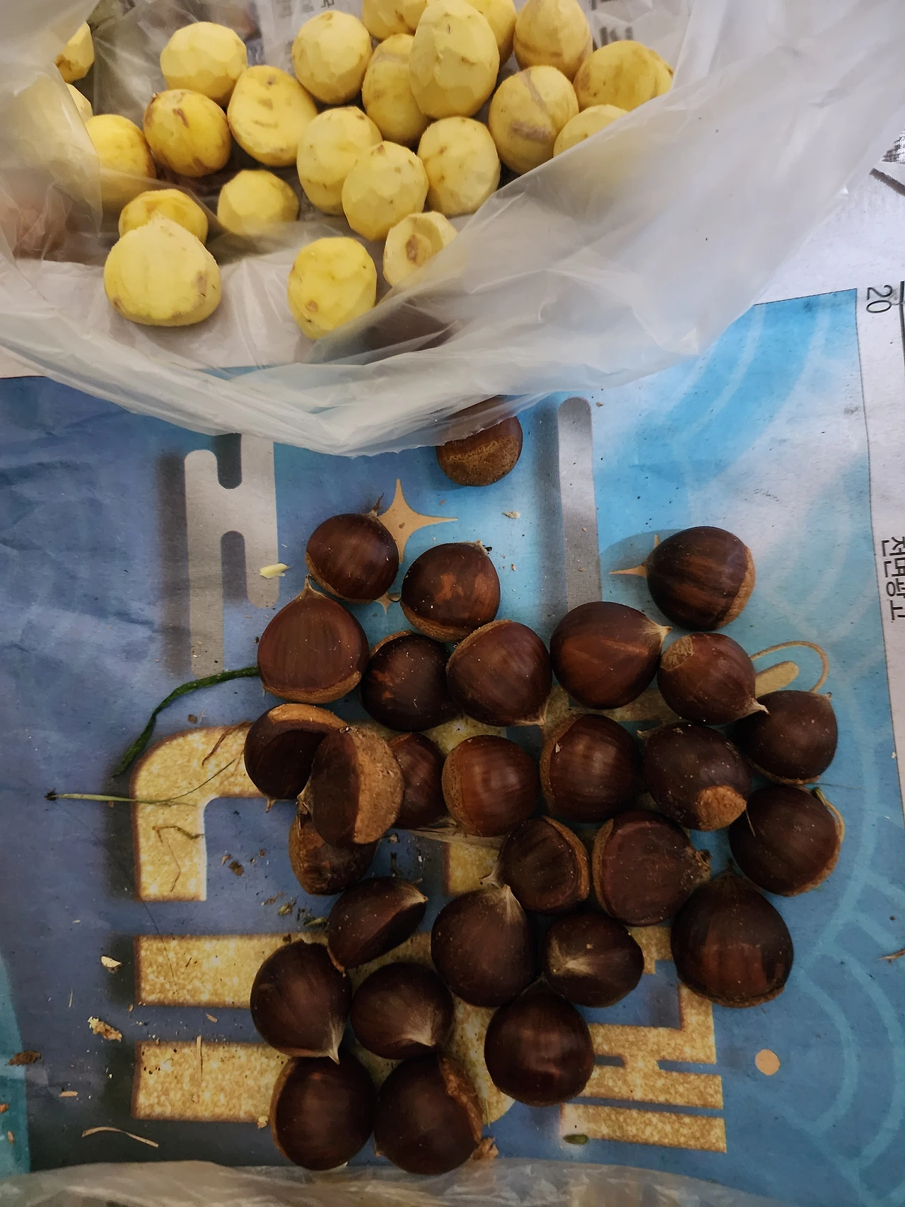 그리고 잠시뒤, 전쟁터에서 승리하고 돌아오는 장군처럼 돌아오시는 엄마의 한손엔 전쟁터 전리품마냥 검정 비닐봉지가 쥐어 있었다. 그안엔 동글동글 밤들이 나를보고 반질반질 웃고 있는듯 했다.